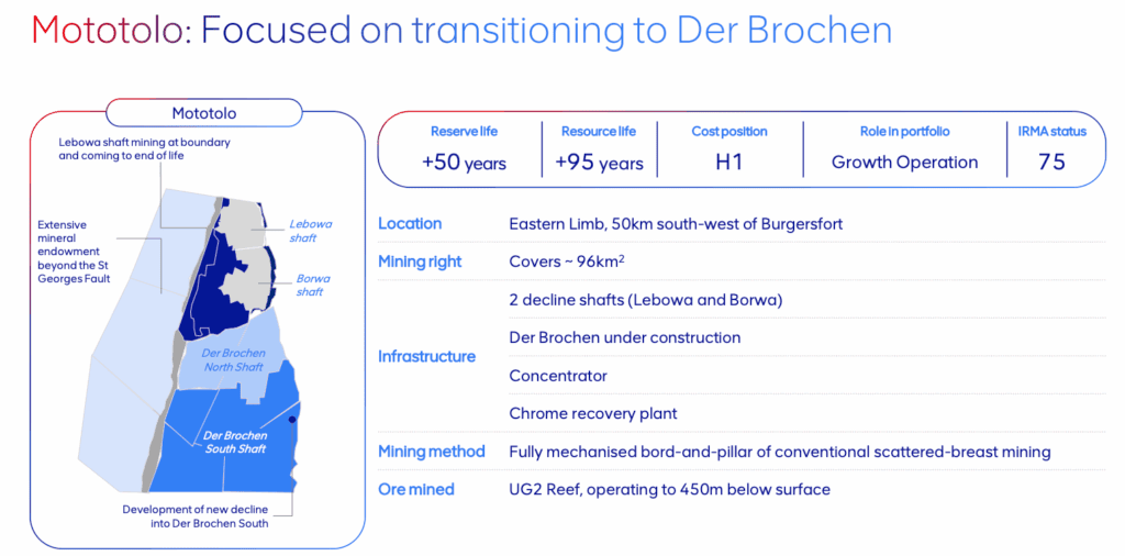 The Mototolo mine (acquired by VALT in 2018) and the adjacent Der Brochen project, located on the eastern side of the Bushveld, have been combined into a single complex to replenish and expand ore from Der Brochen while winding down Mototolo’s Lebowa and Borwa shafts (see below).