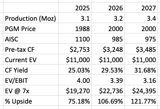 My 2025 PGM prices reflect today’s basket metals prices plus VALT’s split of metal production (see above). At current basket prices, VALT generates $2.75 billion in pre-tax cash flow (25% yield).