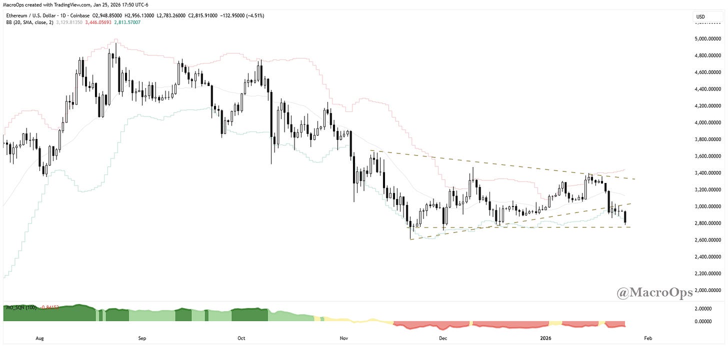 7. Crypto probably offers the best risk-off hedge here. ETH has broken below its wedge, while net spec positioning remains crowded long.