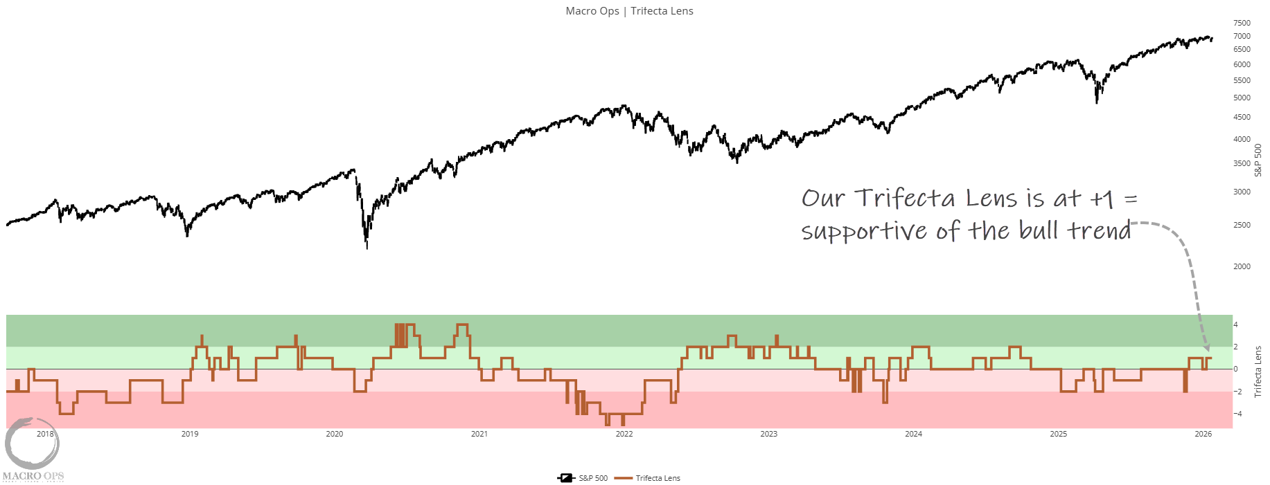 5. Trifecta Lens, our composite measure of technicals, breadth, internals, liquidity, sentiment, and macro, is at +1, which is supportive of the primary uptrend in risk assets.