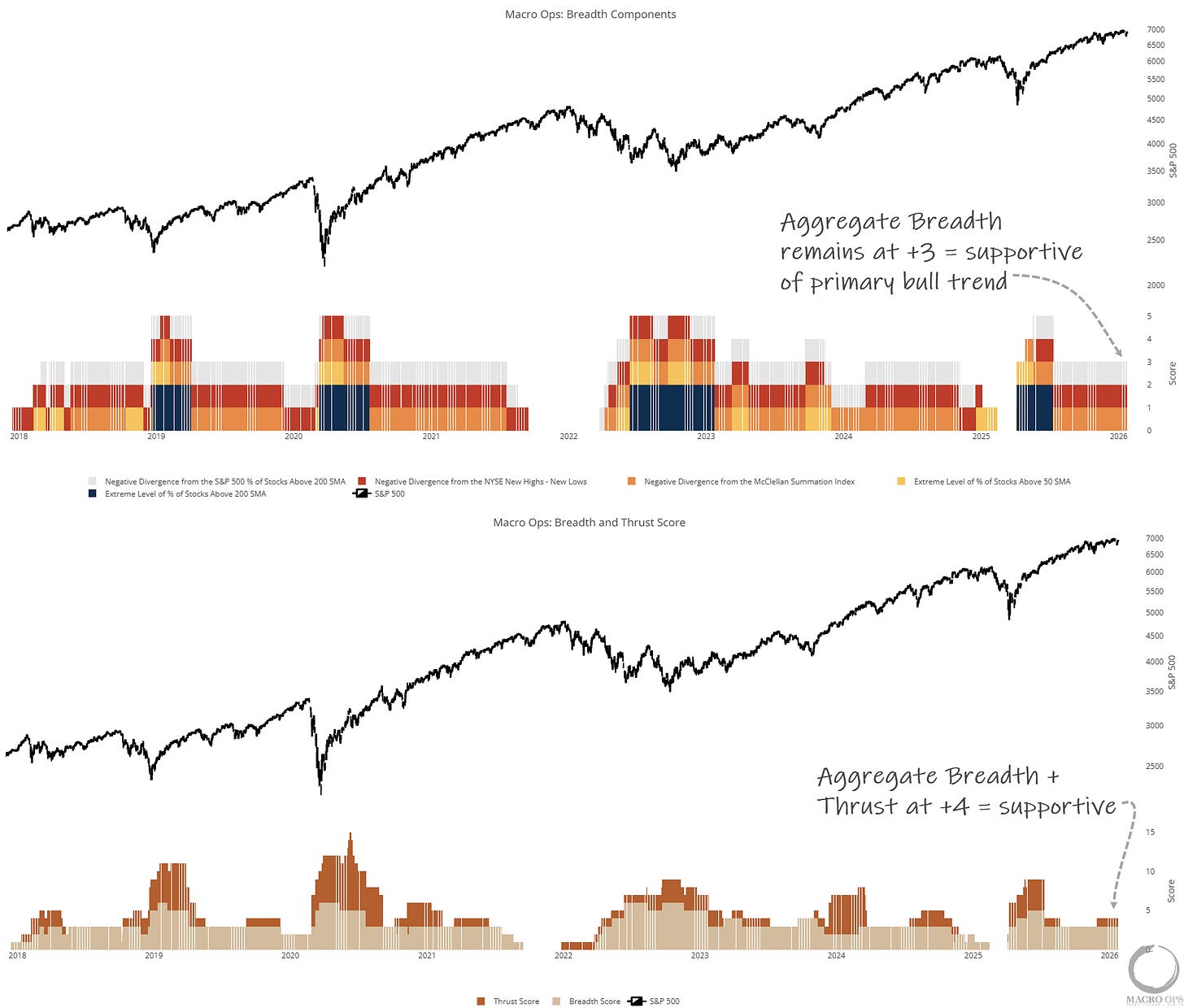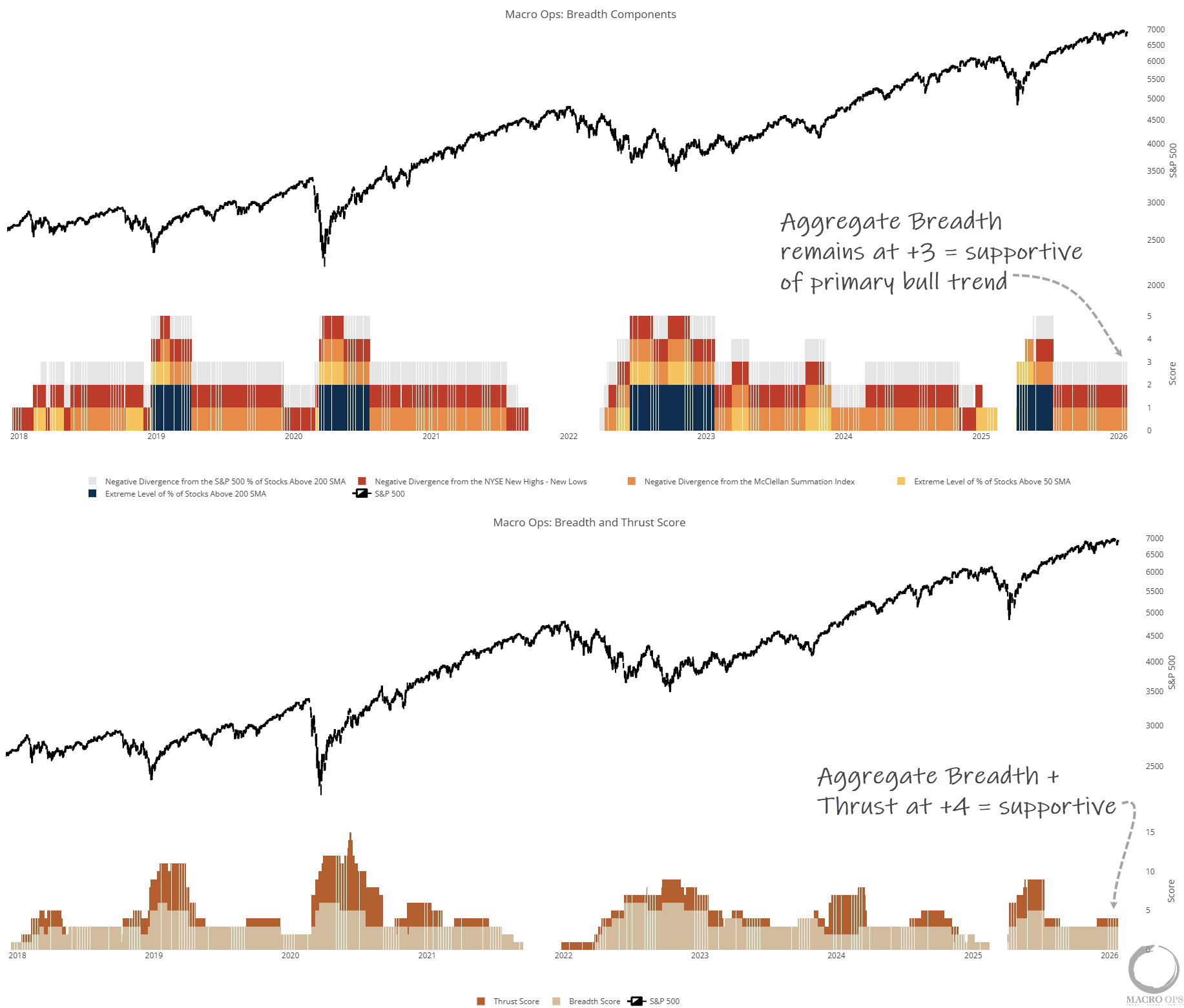 4. Aggregate Breadth is at +3, and Breadth+Thrusts is at +4. These are strong readings, which suggest any market dips will be contained.