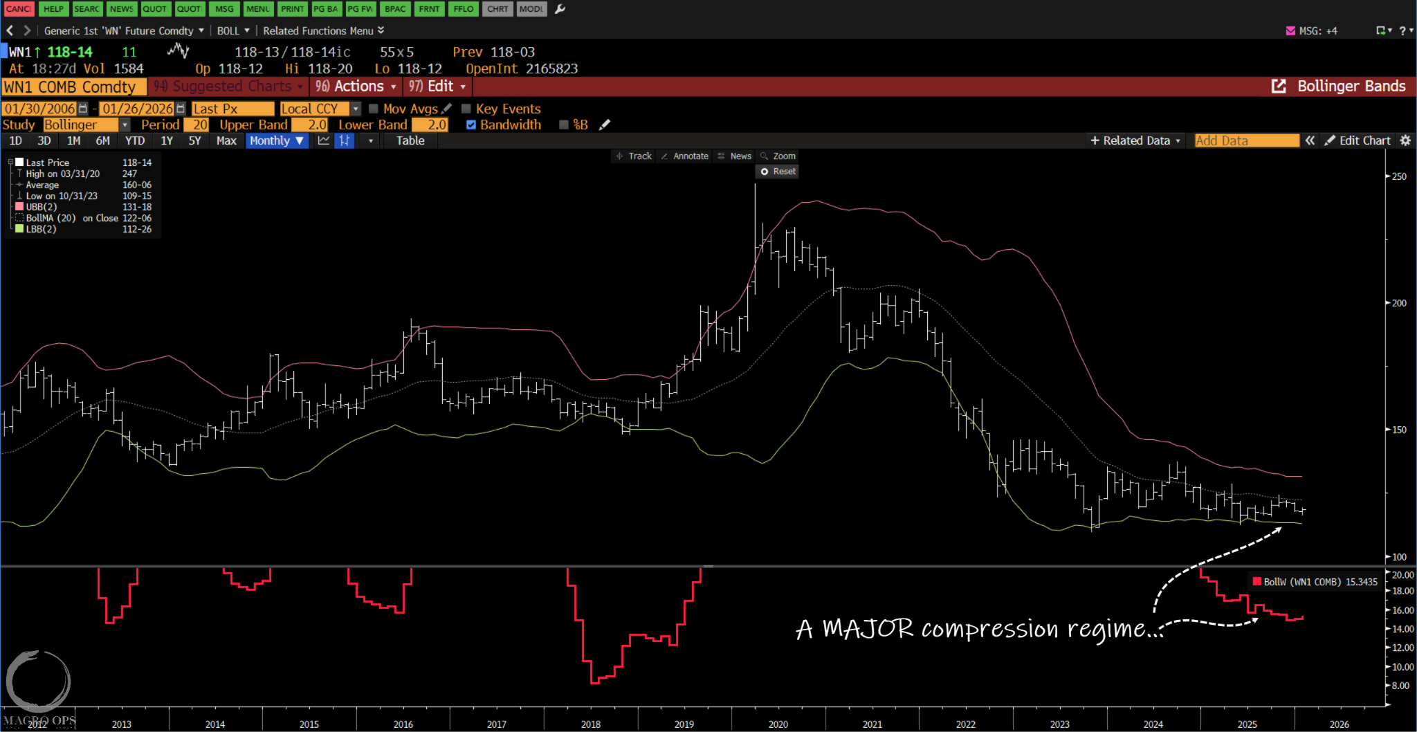 9. We were one of the first shops to start pounding the table on the coming breakout in broad commodities, pointing to the MAJOR compression regime in the Bloomberg commodities index in the early Summer of last year. We also noted the major compression in the long end of the curve, with 30yr bonds (chart below) in their tightest squeeze since Aug 2018, which happened to precede a major multi-year bull run.