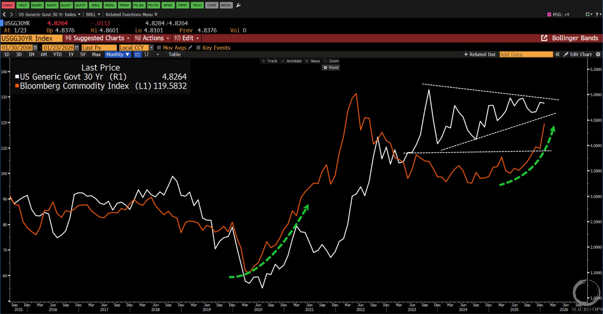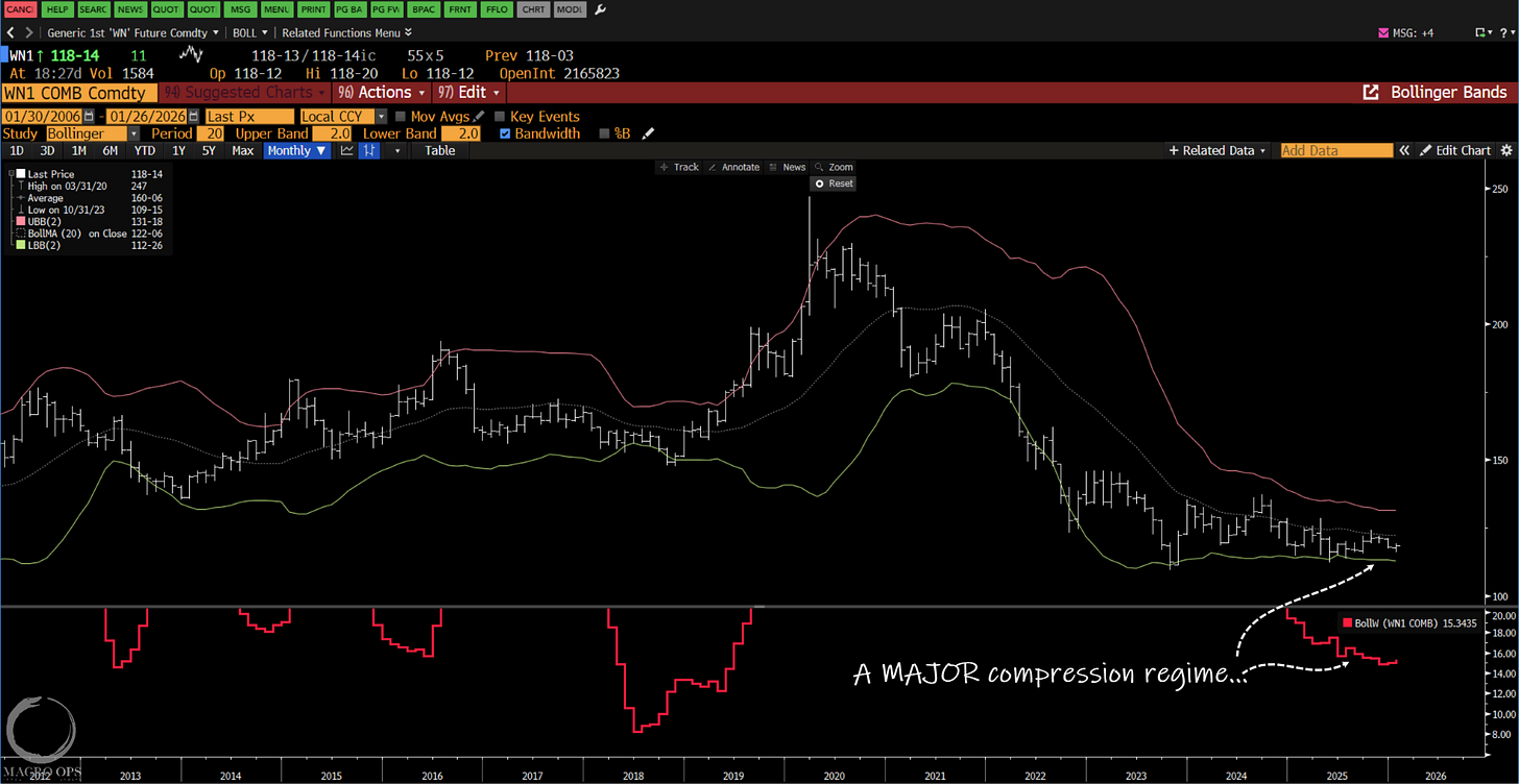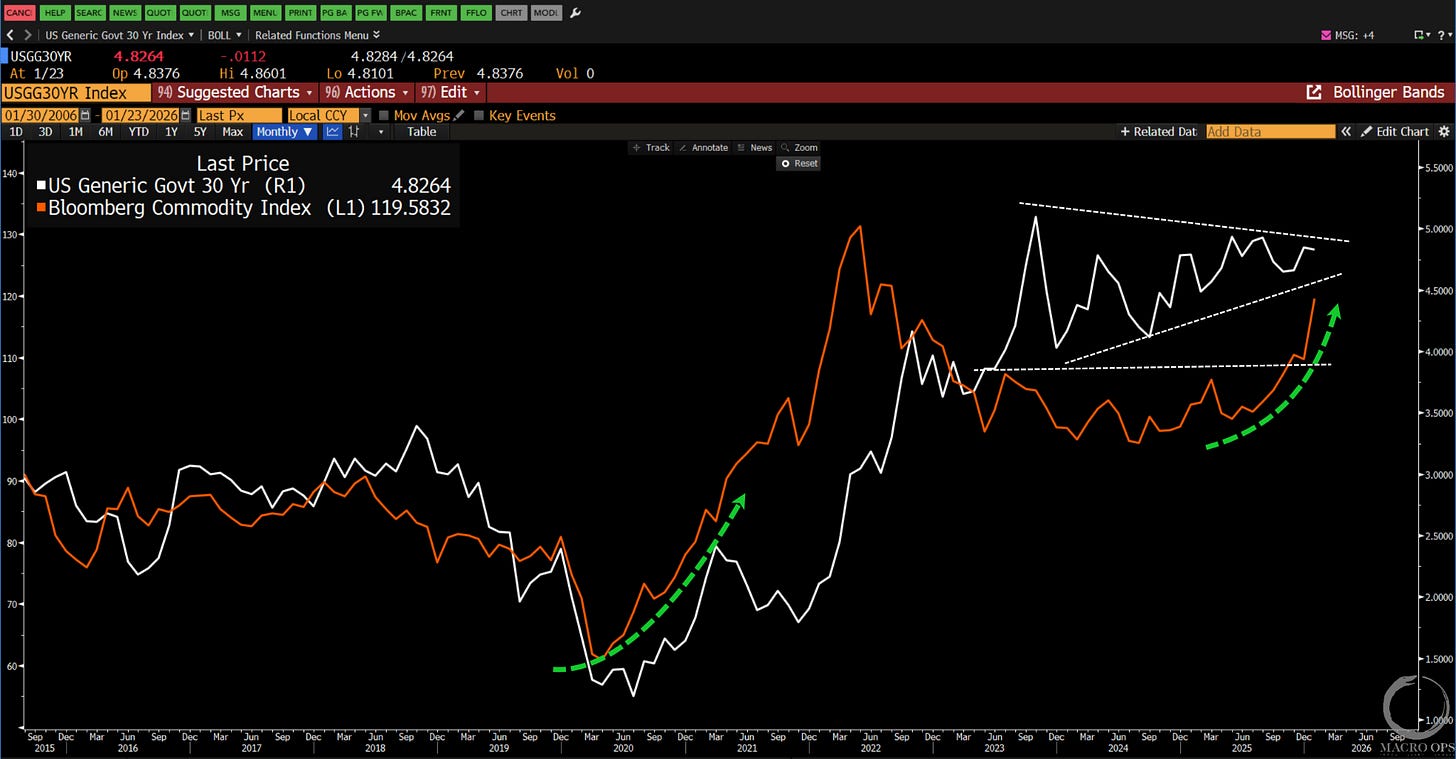 10. Now compression regimes are directionally agnostic. They don’t foretell whether the coming trend will be a bull or bear. But commodities tend to lead yields, as shown below with the BCOM Index in orange and 30yr yields in white. This tells me we’re likely in for a major steepener, with the front end staying pinned and the long end getting clobbered.