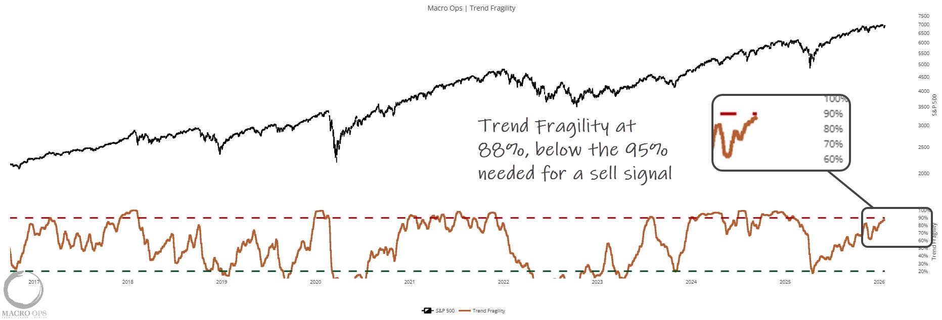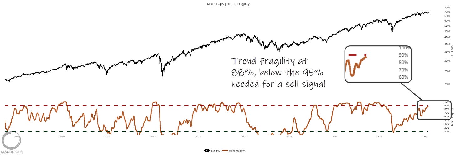 6. However, Trend Fragility is high and climbing. It hit 88% on Friday, which is still below the 95% level that triggers a formal sell signal. This is a conditional signal, so it’s not a reason to be bearish by itself (i.e., stay long but tighten stops).