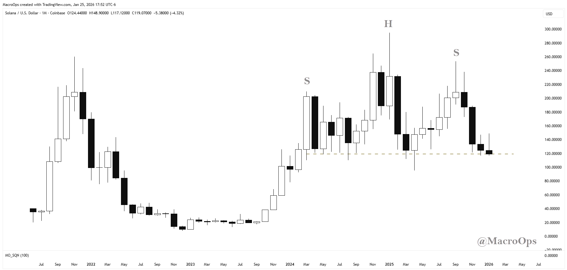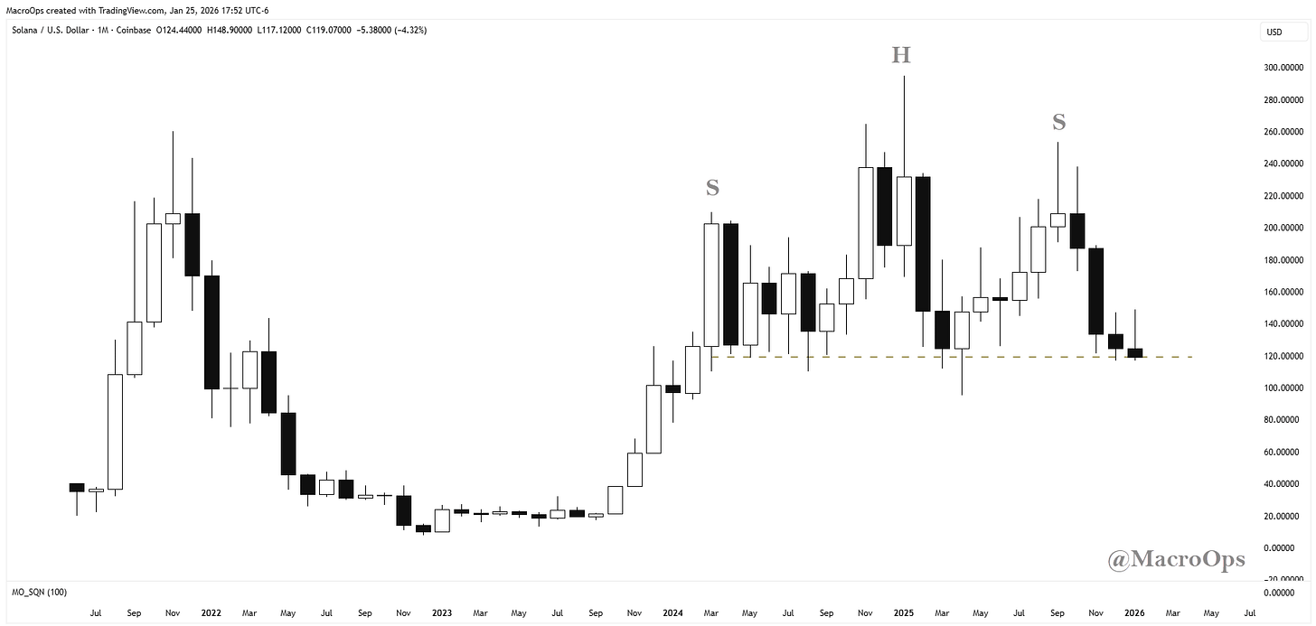 8. Is SOLUSD about to complete a massive 2-year H&S top? It looks likely… We’ll go short on a sustained move below 120.