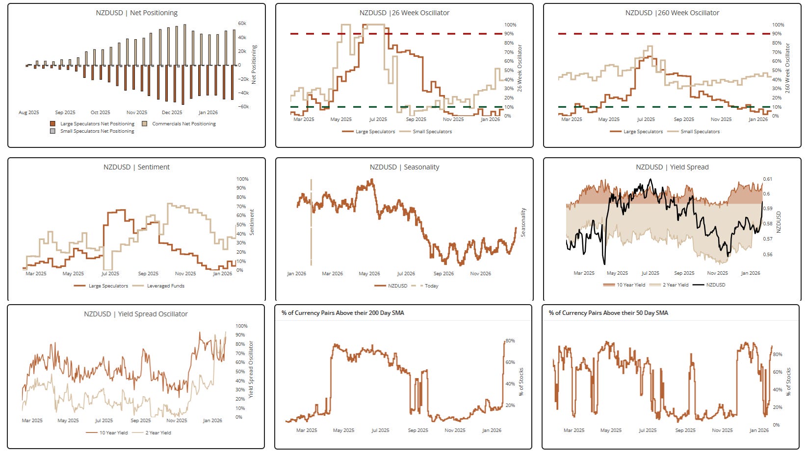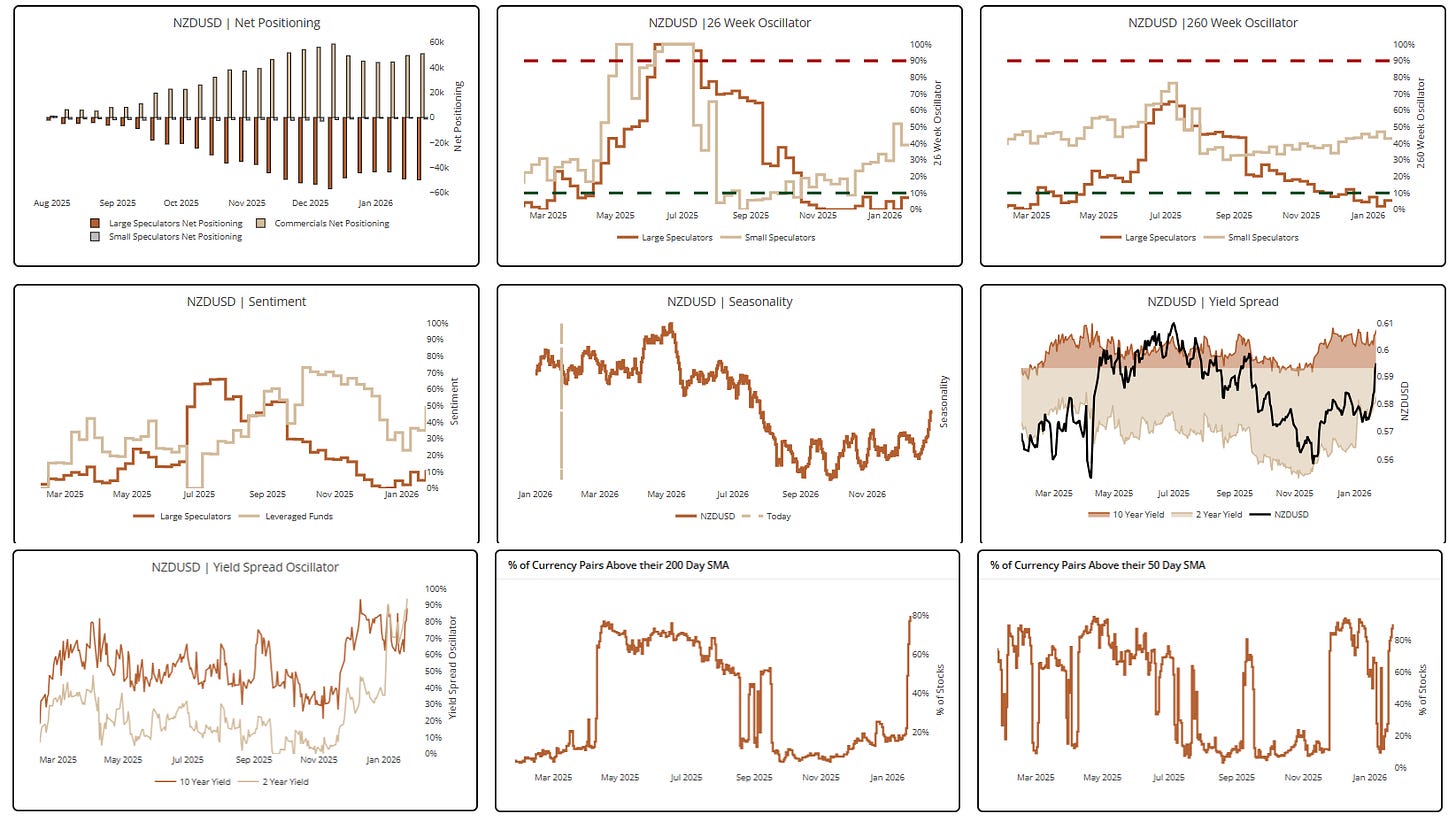 12. We’re quite short the dollar via long MXN & CHF, but we’re also interested in adding long JPY and NZD to that mix. They’re overbought in the near term, but the long-term setup is solid. Both have fairly crowded short positioning, strong yield-spread differentials/momentum, and expanding breadth from bombed-out levels. Charts from our multi-chart view in our HUD.