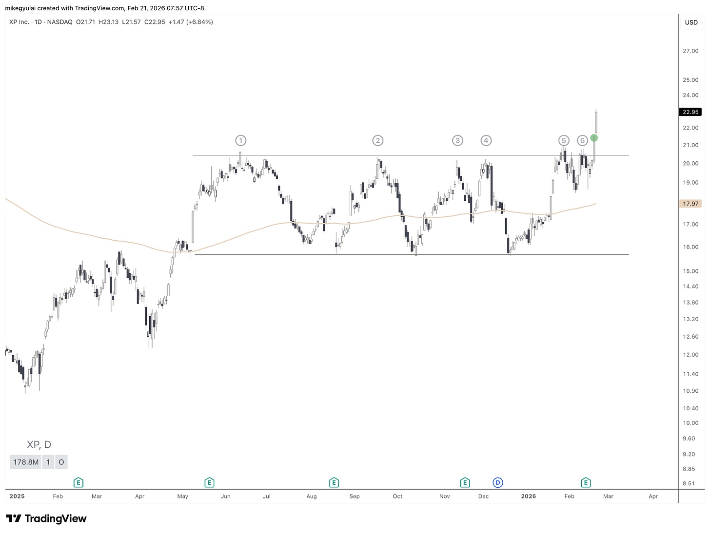 Just this week, XP, Inc. (XP) broke out of a nine-month range with a wide-body bar, and followed through with equal strength on Friday: