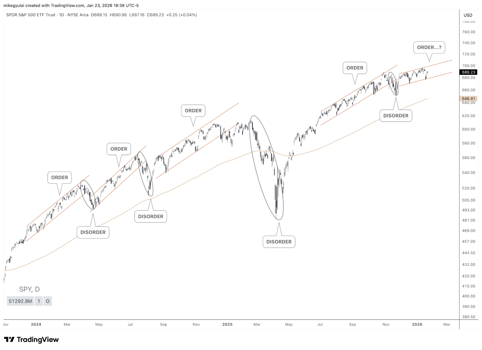 The last two years of action on the SPY could be characterized as a series of orderly price trends which formed multiple upward channels, followed by disorderly breaks below those channels before price found its footing anew.