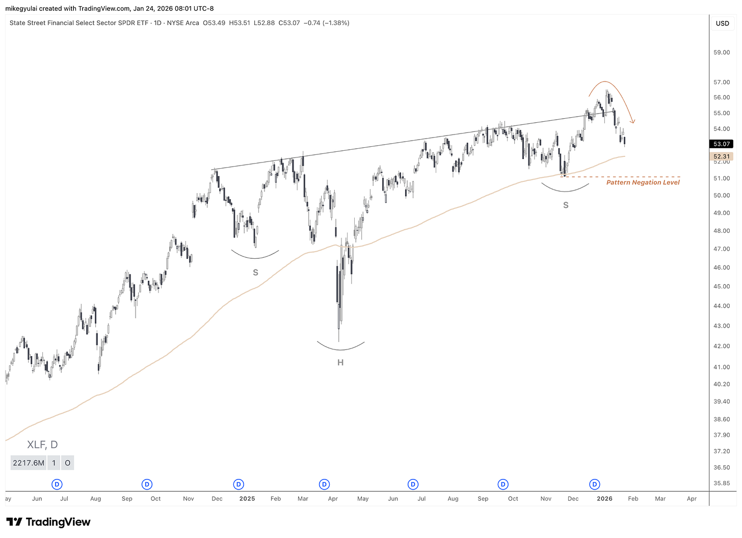 The Head & Shoulders Pattern Negation level stands at 51. Note: this is not a Stop Loss, but rather the level at which the market structure would develop a lower low compared to the Right Shoulder, thereby negating the Head & Shoulders interpretation.