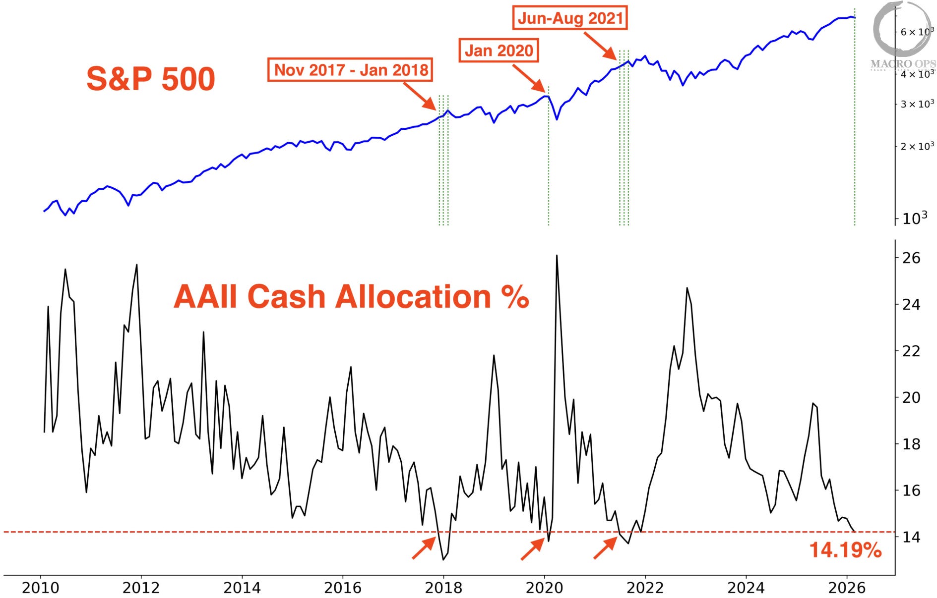 9. From @SubuTrade: “Cash allocations at 14.19% — investors holding the least cash in 4 years. This happened 3 times in the past 20 years: late-2017, Jan 2020, late-2021. Each preceded significant volatility and losses.” This checks with the FINRA Margin Debt data we shared last week.