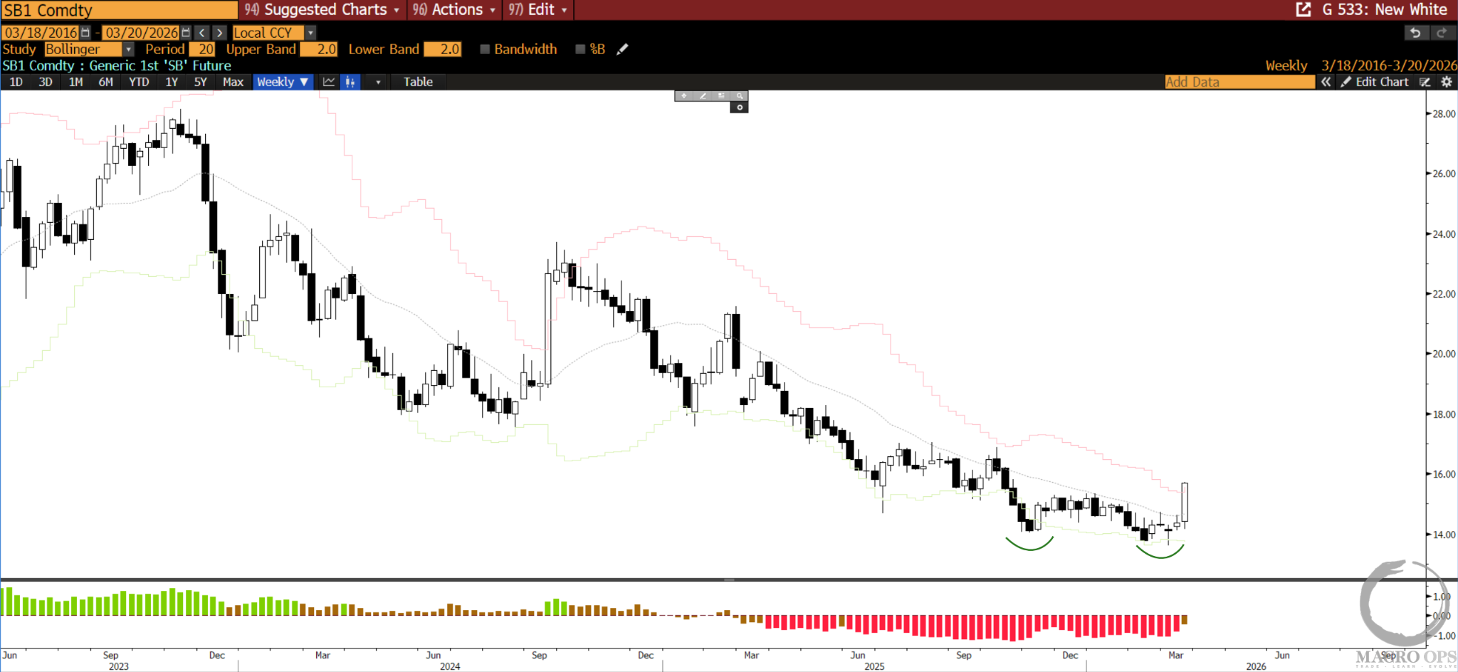 2. Two weeks ago I flagged the developing double-bottom in sugar — Trifecta setup with sentiment, macro, and technicals all lining up. Last week confirmed the bottom and it’s off to a nice start. We’re long.