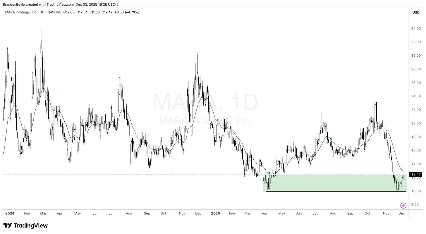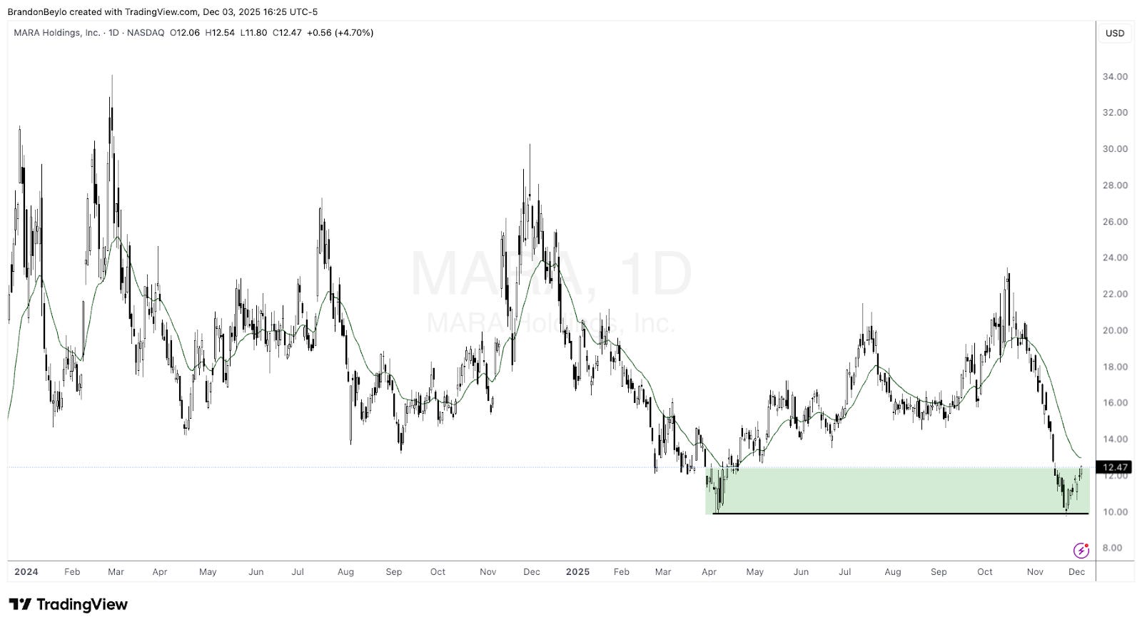 MARA has a similar chart and trade, but with more torque, as it’s a derivative of the underlying BTC asset.