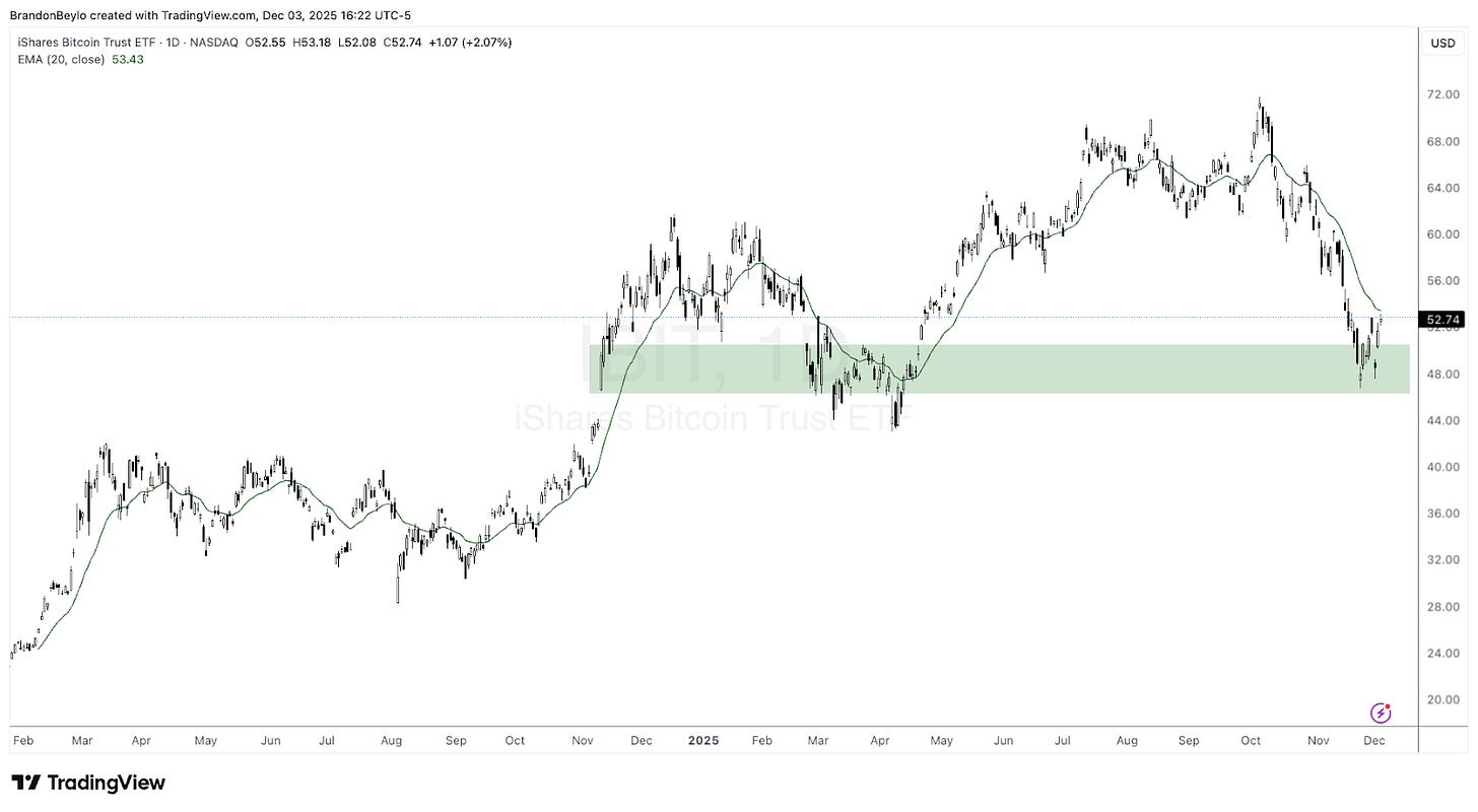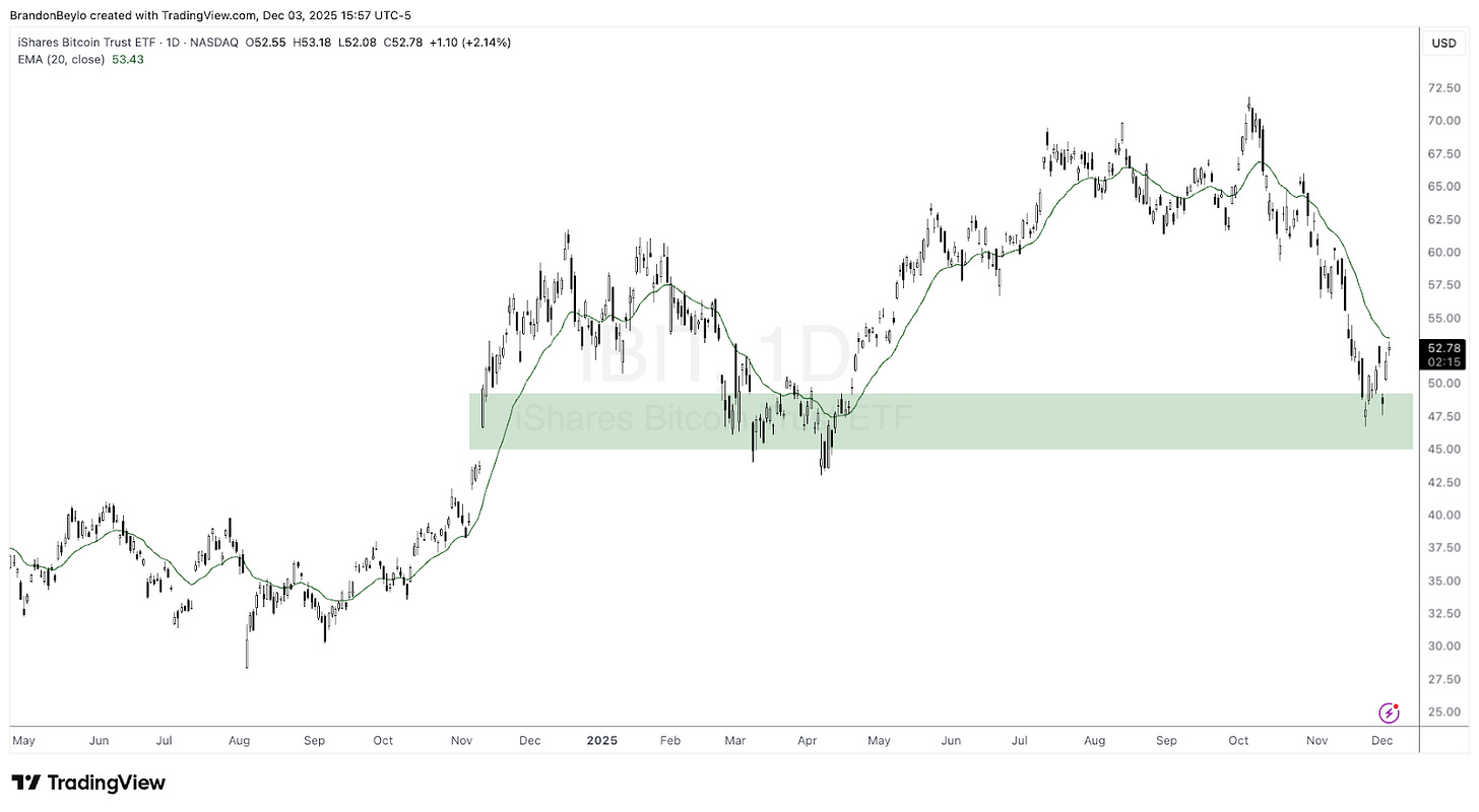 IBIT bounced off support at ~$49-50/share and is close to breaking out above its 20D MA (or midline).