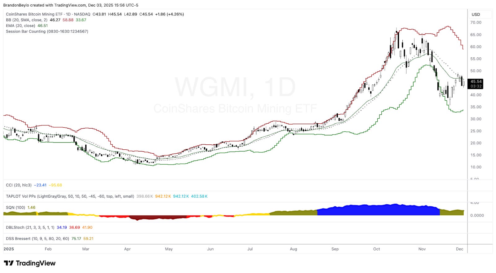 WGMI is down ~19% over the past month, a product of its Bull Volatile/Blended Bull Quiet market regime (see chart below).