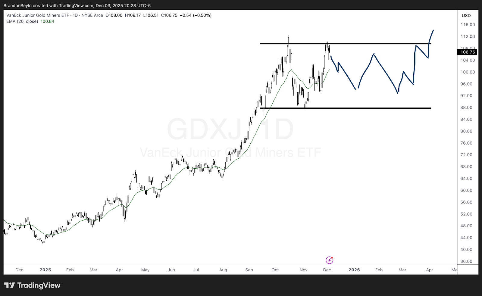Here are my thoughts on GDXJ. Like SILJ, I’d love to see GDXJ trade sideways for a few months before its next breakout. This would allow larger allocators time to rotate capital into the theme before the next leg higher (giving the breakout more juice).