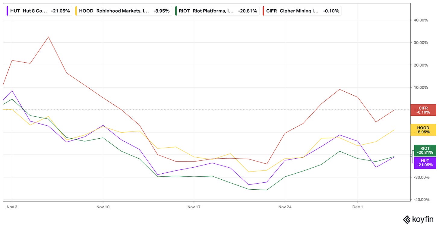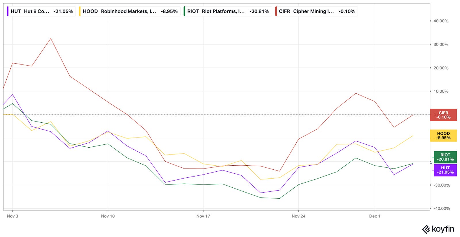 My basket approach of HOOD, CIFR, RIOT, and HUT performed horribly, returning -10% on average over the past month.