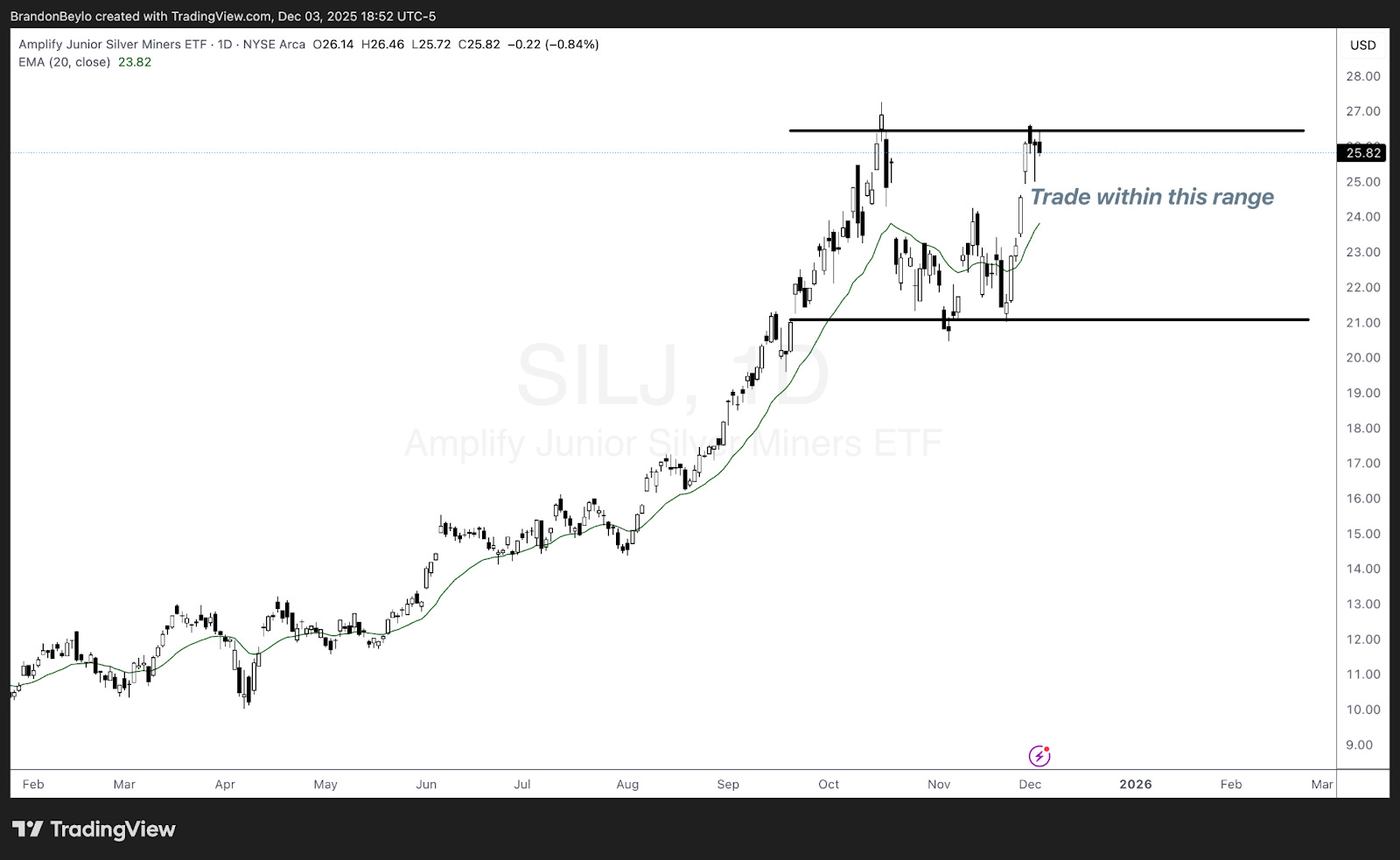 We bought SILJ on 11/26 at an average cost of $24.57. Our October price action hypothesis played out; we followed our process and got long. However, I still anticipate sideways trading action over the coming weeks, which would be healthy for a sustained silver junior bull run.