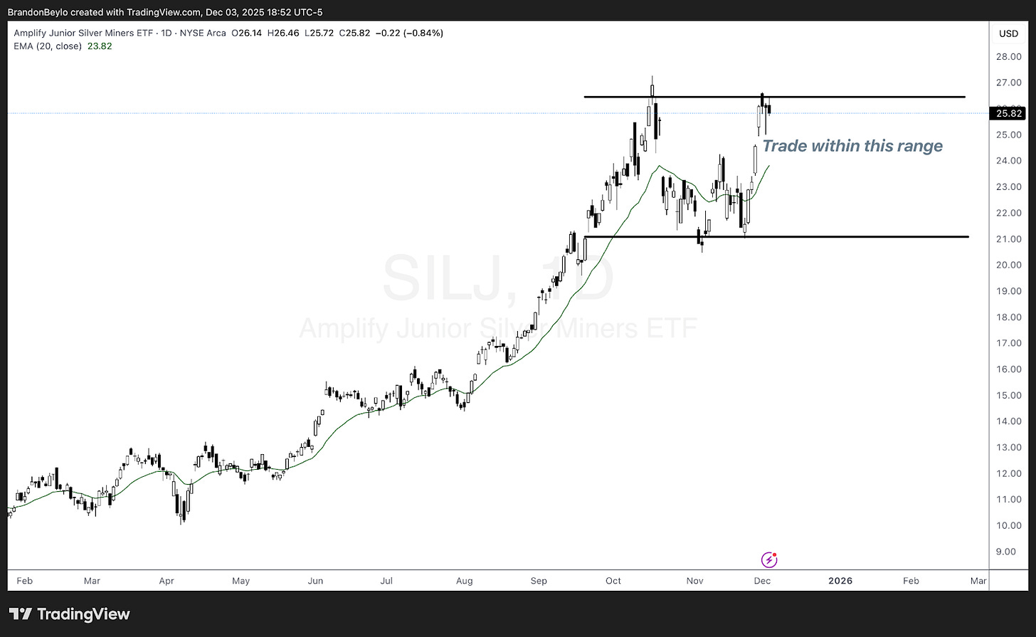 SILJ is down ~20% from its recent highs, back to the 50D, and trading in a Bull Quiet Regime. A breakout above the midline would signal risk-on in the PMs trade.”