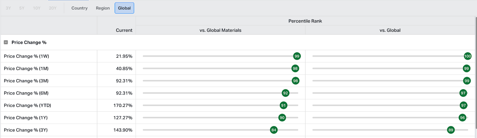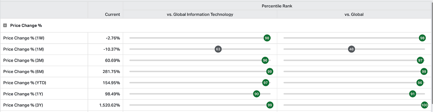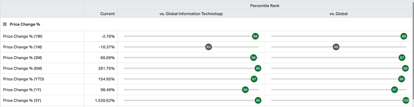 The relative strength against the market and its peers (consistently in the 90th-95th percentile across multiple time frames).