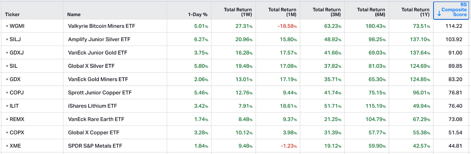SIL and GDX are back in the top five after a ~2-month hiatus. They replace the Space (UFO) and Copper Juniors (COPJ) thematics.