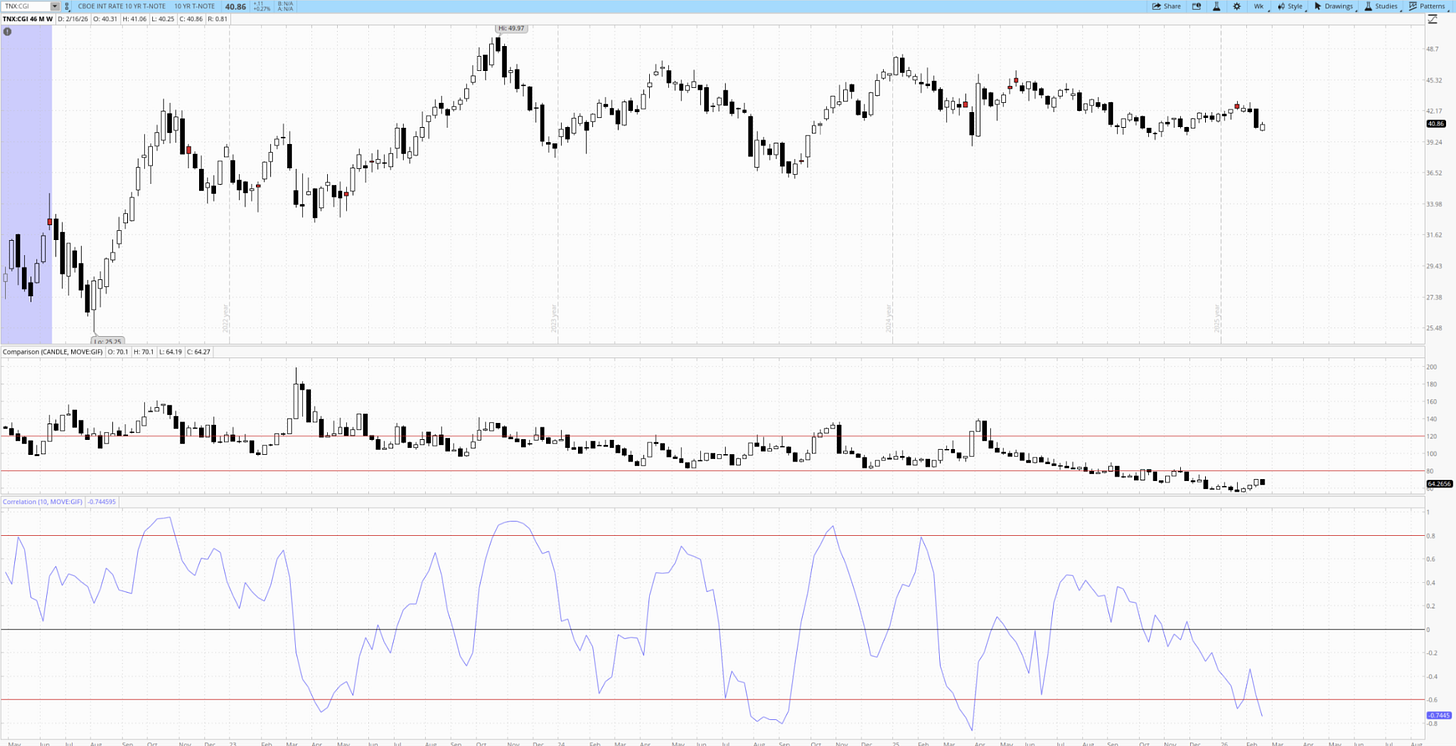 “The correlation is very low due to the MOVE index climbing since late Jan while rates have dropped. Extreme correlations like this have historically preceded a spike in rates. With the MOVE index already so low, it’s reasonable to think that the correlation normalizing will happen with rates turning higher.”