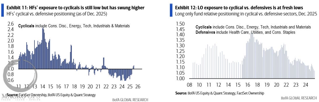 10. While a number of cyclical industries have been on a tear these past few months, and are arguably overbought over the very short-term. The two charts below from BofA show that, from a repositioning standpoint, this trend is very early days. Imagine AI continues to rerate software lower, but strong growth and flush liquidity keep this from becoming a broader cyclical bear. That money has to go somewhere. And that somewhere is international equities, commodities, hard assets, and cyclicals. And the relative difference in market caps is so large that, well, we can see some wild moves.