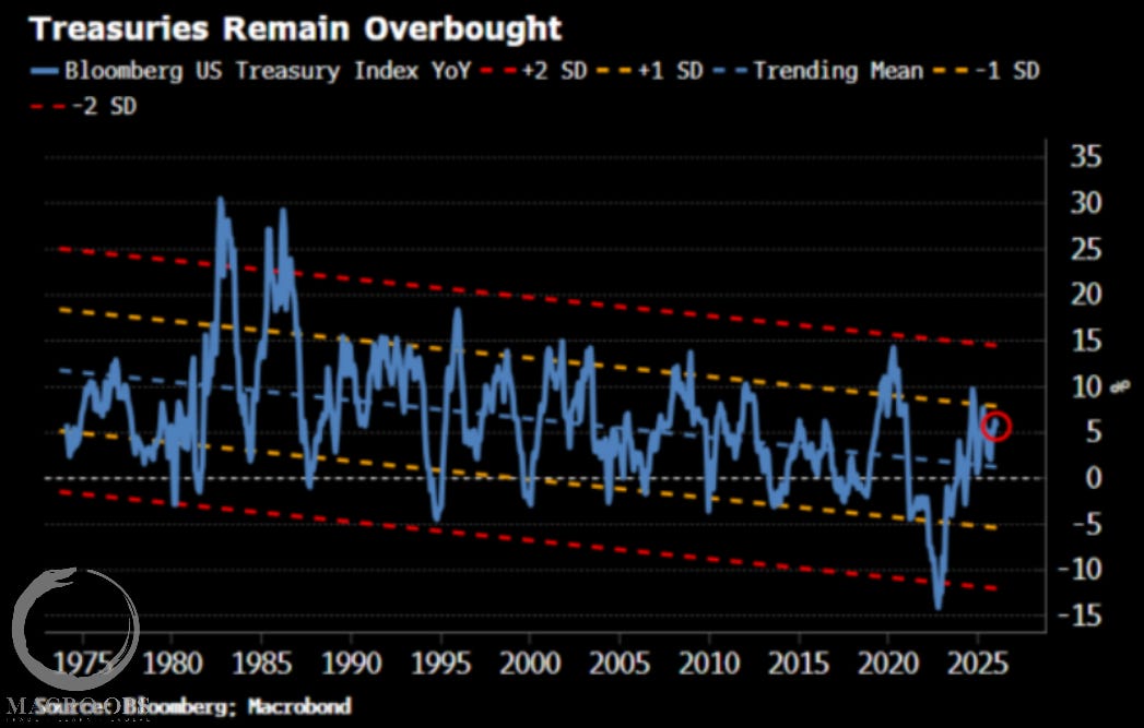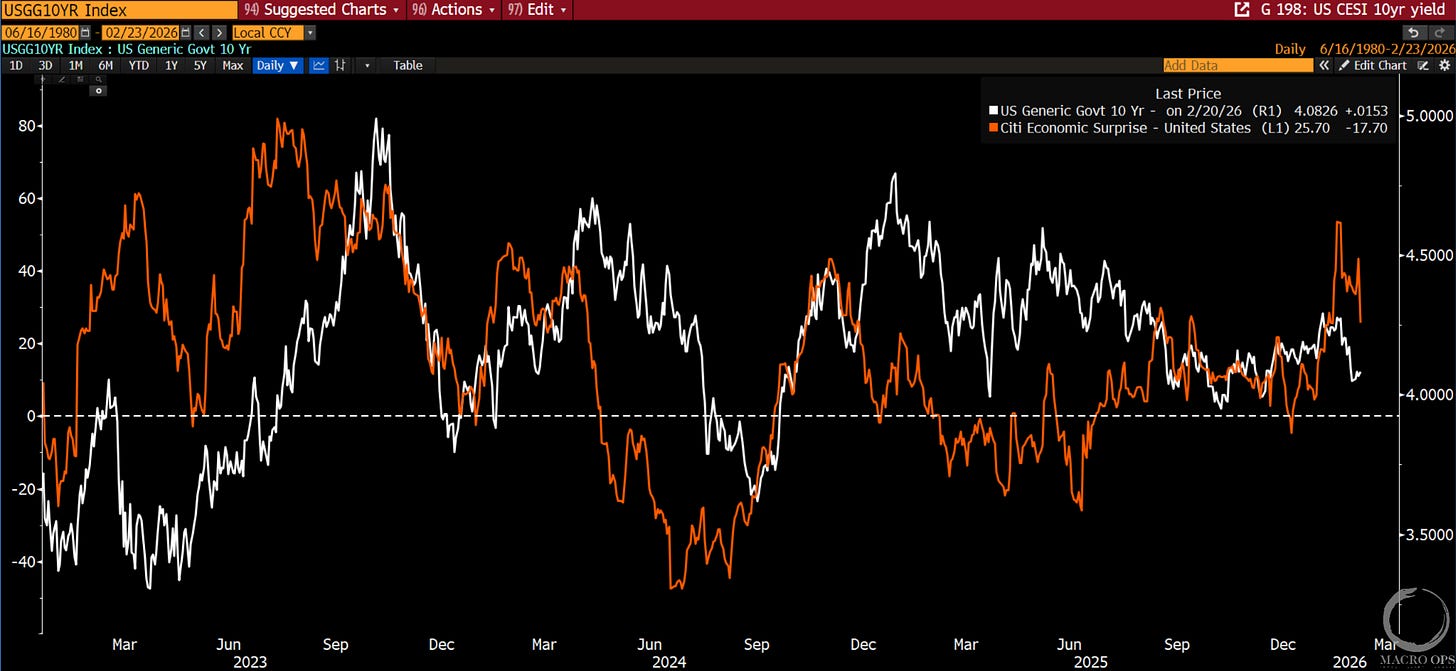 8. I’ve been spending a decent bit of time sifting through charts to see if I can get more of a feel for which direction this compression regime in rates will resolve itself. The chart below shows CESI - Citi’s Economic Surprise Index (orange line) and the 10yr yield (white). A few weeks ago, CESI hit its highest reading since mid 23’. It’s since come off a bit following last week’s disappointing GDP print, but those numbers were distorted by November’s government shutdown — strip that out and the read was strong. We expect more positive growth surprises ahead, which should act as upward pressure on rates.