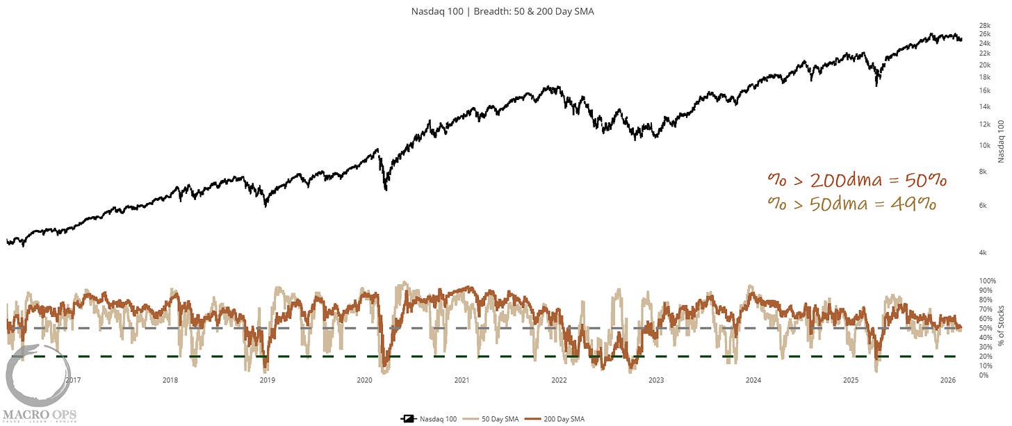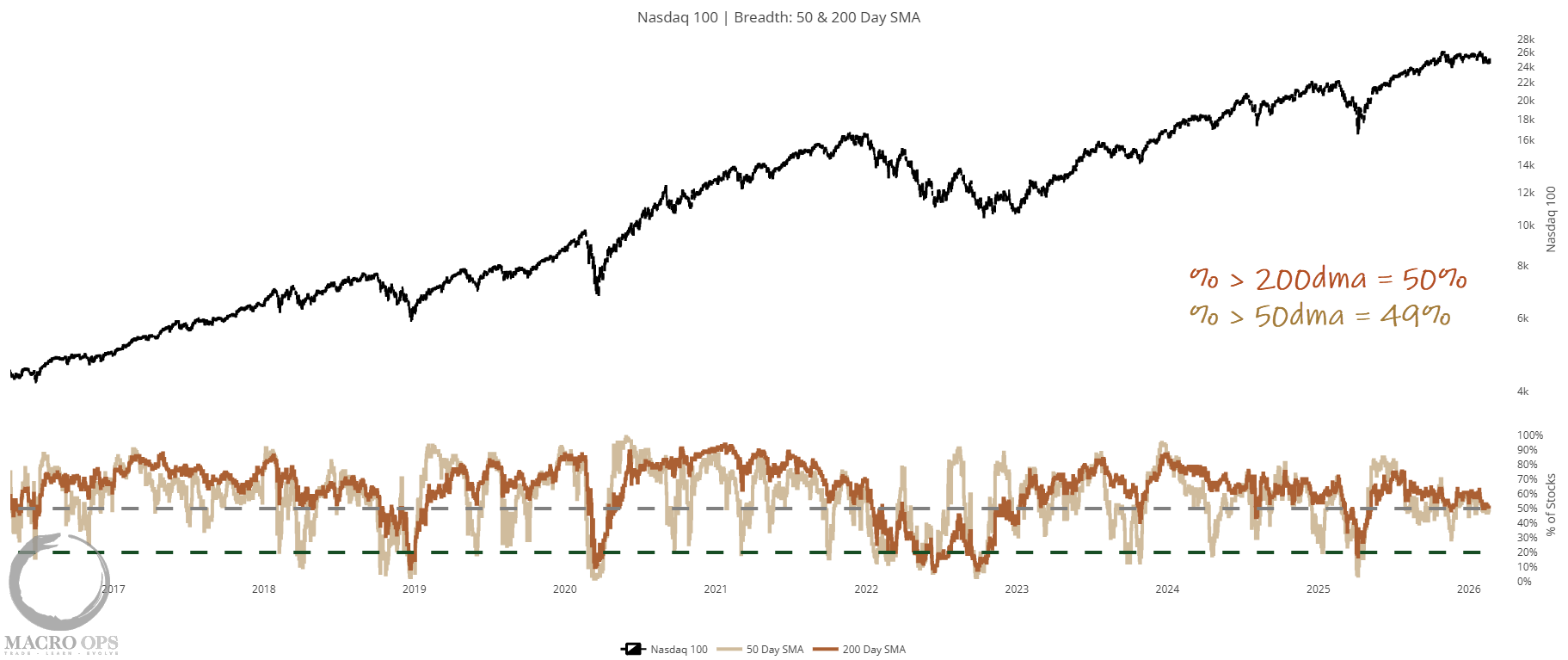 5. But tech continues to trade heavy, as shown below with the % of Nasdaq stocks trading above their 200 and 50 day moving averages as just 50% and 49% respectively. Any further deterioration here, and the Qs start rolling over.