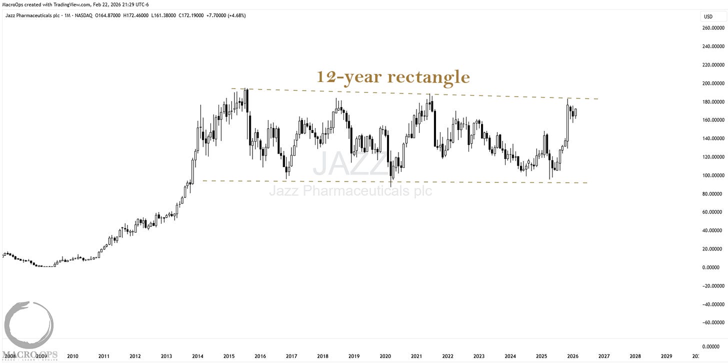 12. This is a monthly chart of Jazz Pharmaceuticals (JAZZ). It’s near the upper-range of its 12-year rectangle. It’s in the lower decile of its relative performance to the biotech sector. Earnings are on Tuesday. If earnings surprise, this one could move fast.