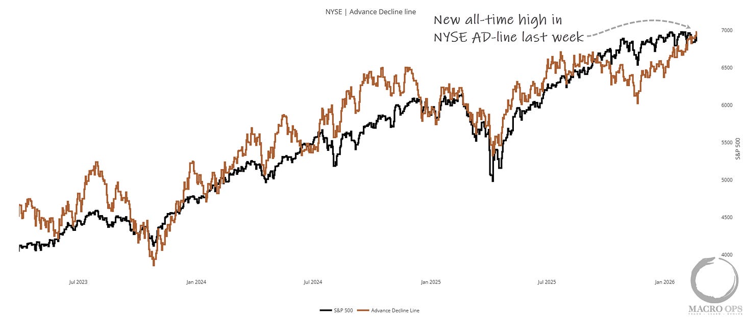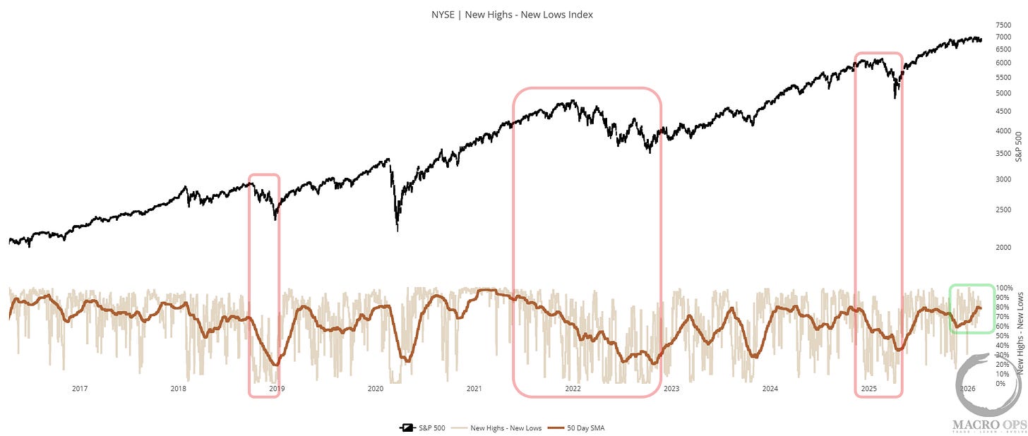 4. Breadth tells two different stories depending on which part of the market you’re looking at. Here we have the NYSE A-D Line making a new all-time high, diverging higher from price. And the NYSE New High-Lows Index showing underlying action that’s typical of a strong bull.