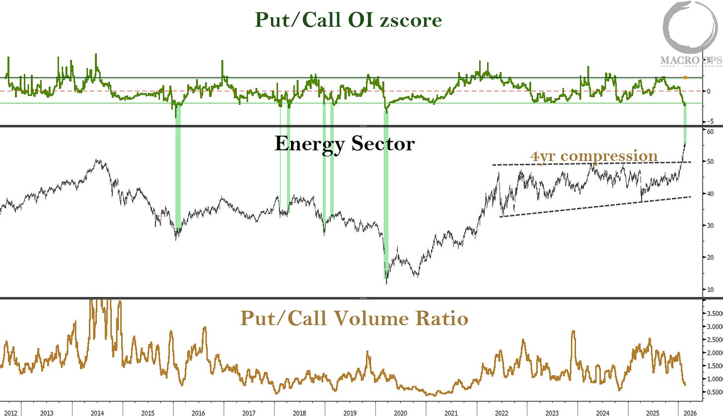 But… I don’t believe we are anywhere near even an intermediate top, let alone a cyclical one. Again, the total relative market cap of energy versus, say, software has become so tiny that it doesn’t much of the way to a reversal in flows to rerate the sector massively higher. What’s interesting is that most of these flows are unhedged, as indicated by the low put/call scores, suggesting that institutions are likely allocating here with more patient capital.