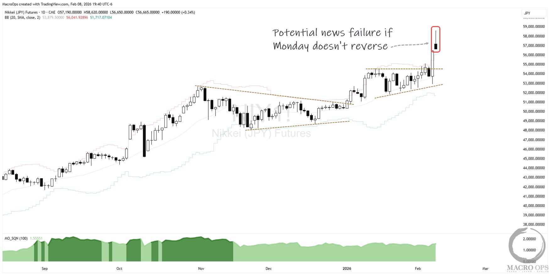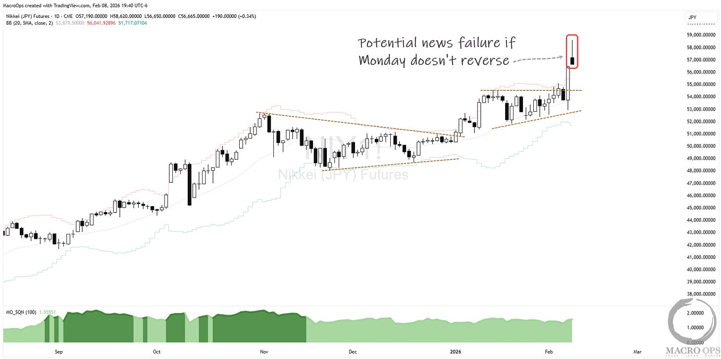 10. The Nikkei broke out last week from a compression/wedge within a Bull Quiet regime. We had buy stops triggered on Friday’s move to add to our existing long position. The market gapped up on Sunday’s open (as I write this) on the results of Takaichi’s LDP victory in the snap elections, where they secured 316 seats, giving them a comfortable supermajority, and the political capital to pursue their full fiscal agenda. It appears to be reversing, and we’ll have to see how it closes, but if it closes red on the day, that’d be a notable news failure.