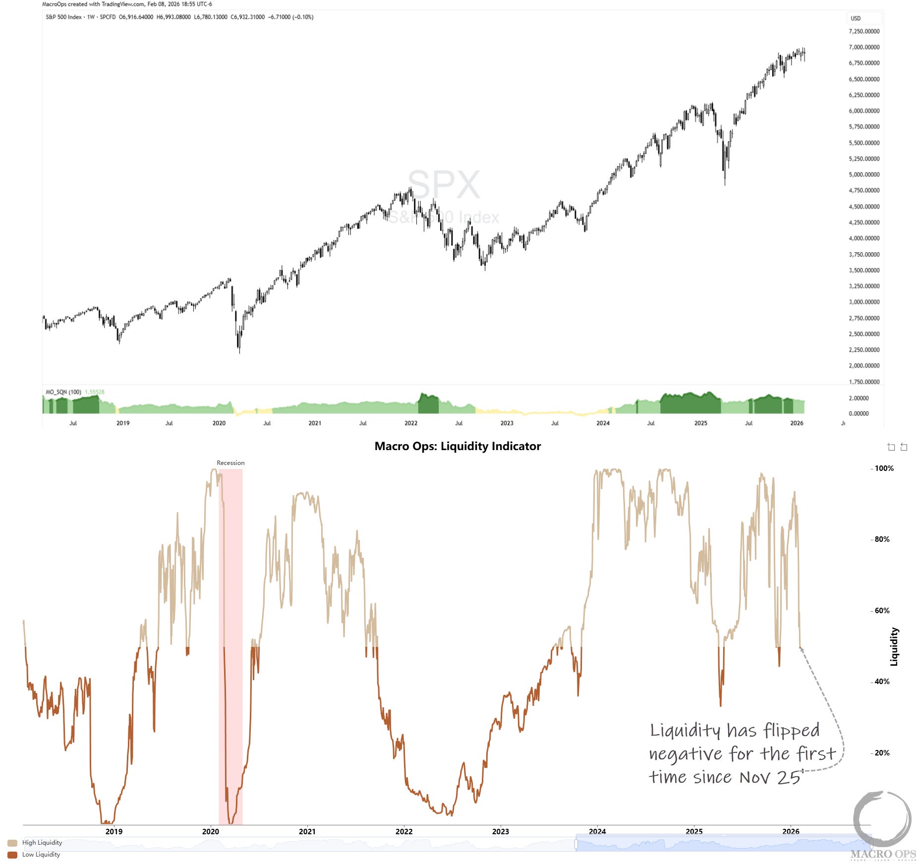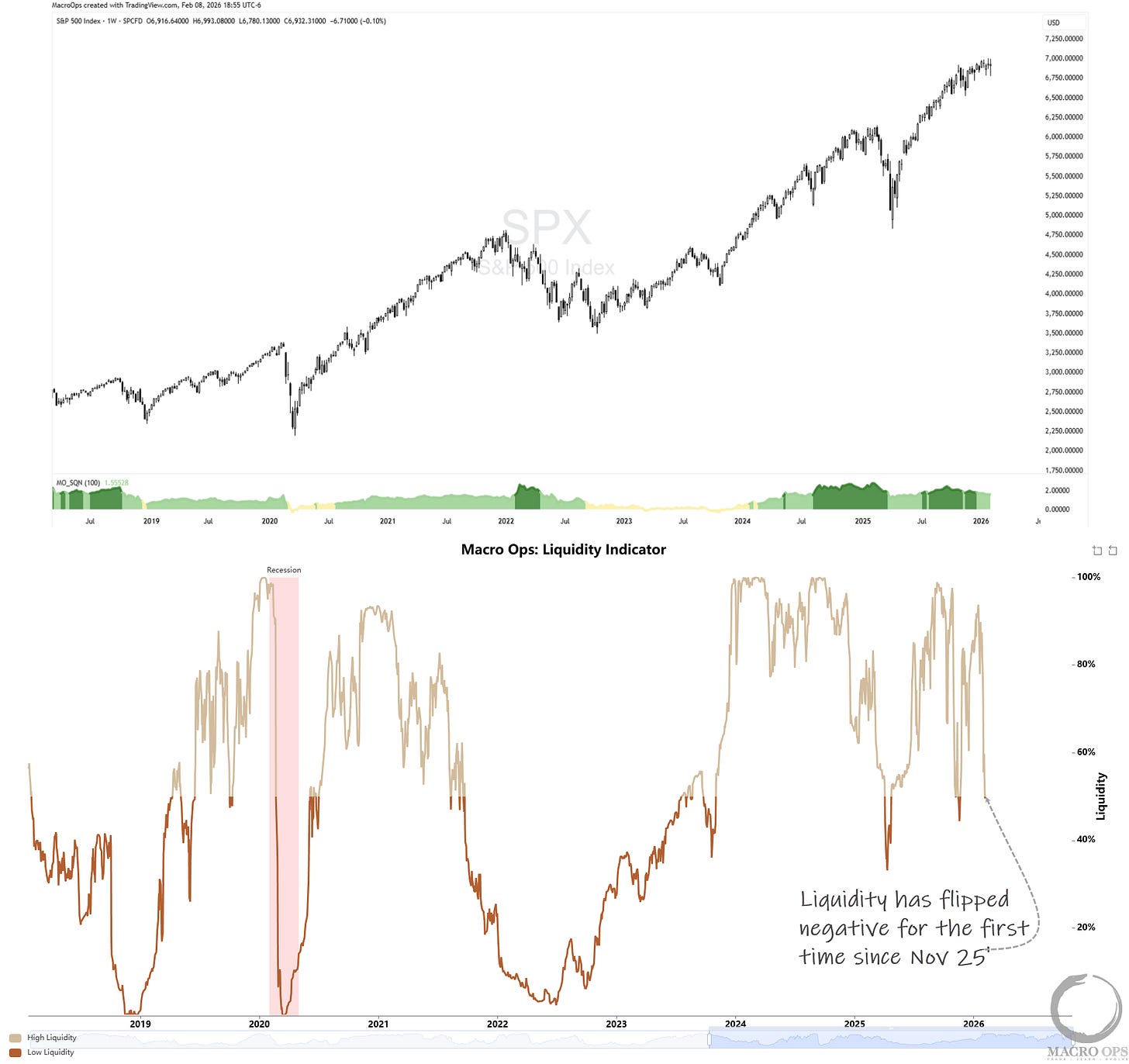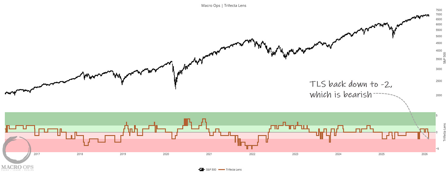 1. Our Trifecta Lens Score (a composite of macro, liquidity, technicals, and sentiment) fell to -2 last week, which is bearish. It was driven lower by a big drop in liquidity, which has flipped negative for the first time since Nov of last year.