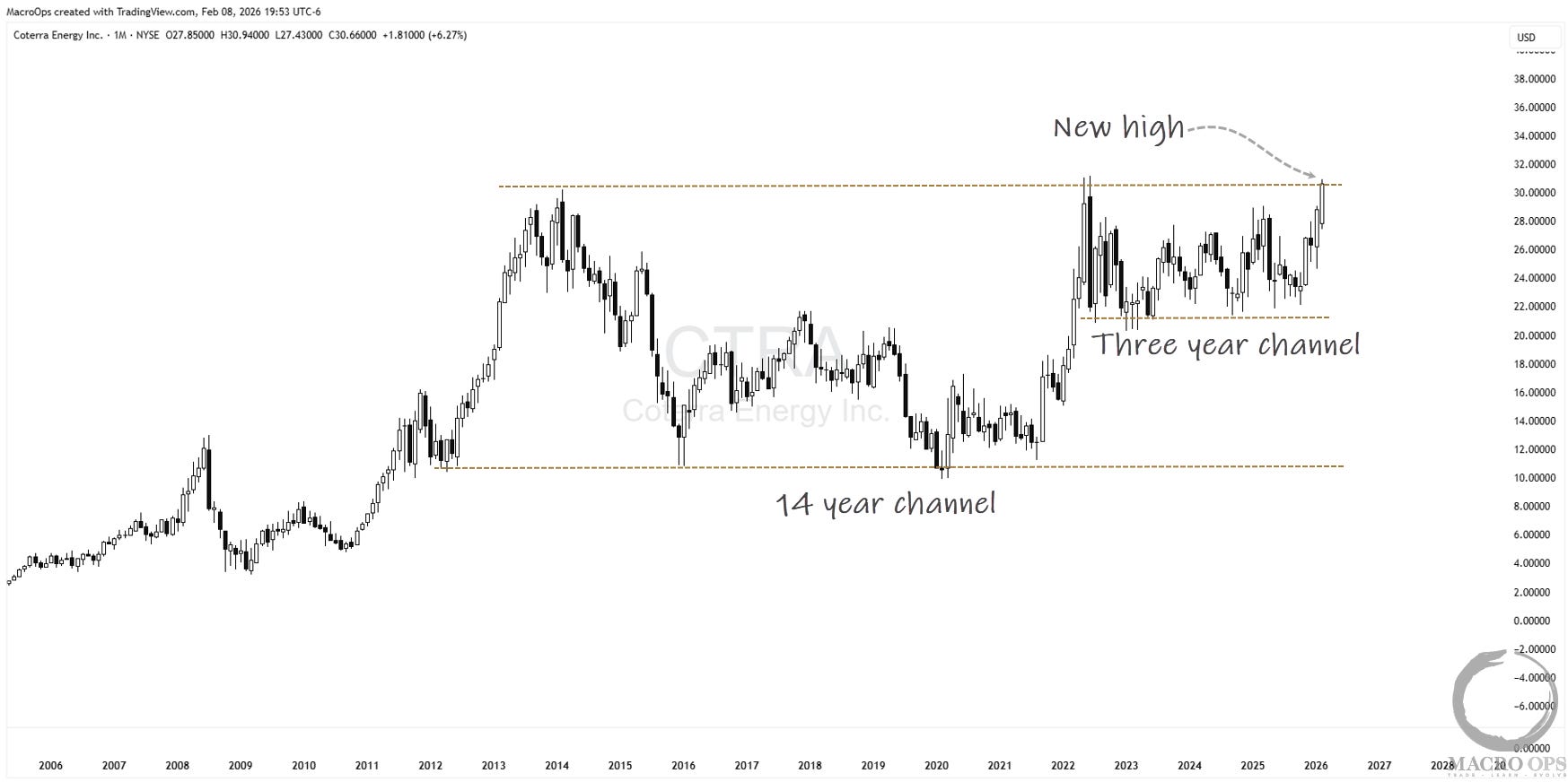 11. For the past month, our focus has been on industrials and energy, and that hasn’t changed. Last week, I shared the chart of CVX, which has broken out. Here’s another one we’ll be adding to our book. Coterra Energy (CTRA) is breaking out of a 3-year channel within a larger 14-year channel. That’s a lot of pent-up energy for a run higher.