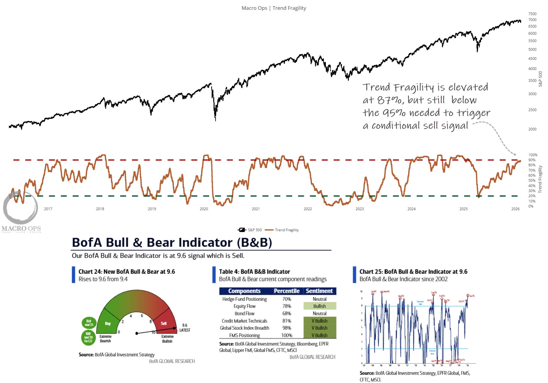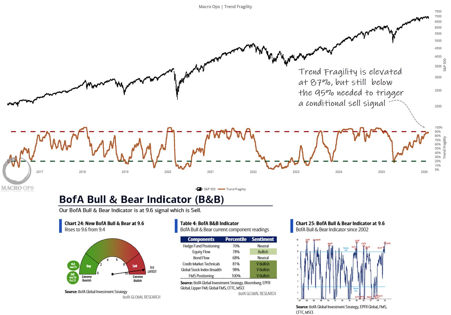 4. Our Trend Fragility score (a composite of sentiment and positioning indicators) is elevated at 87%. But, this is below the >95% threshold for a conditional sell signal. While BofA’s Bull-Bear indicator is at its highest since March of 06’, triggering a sell signal, where forward 3m returns are historically poor.