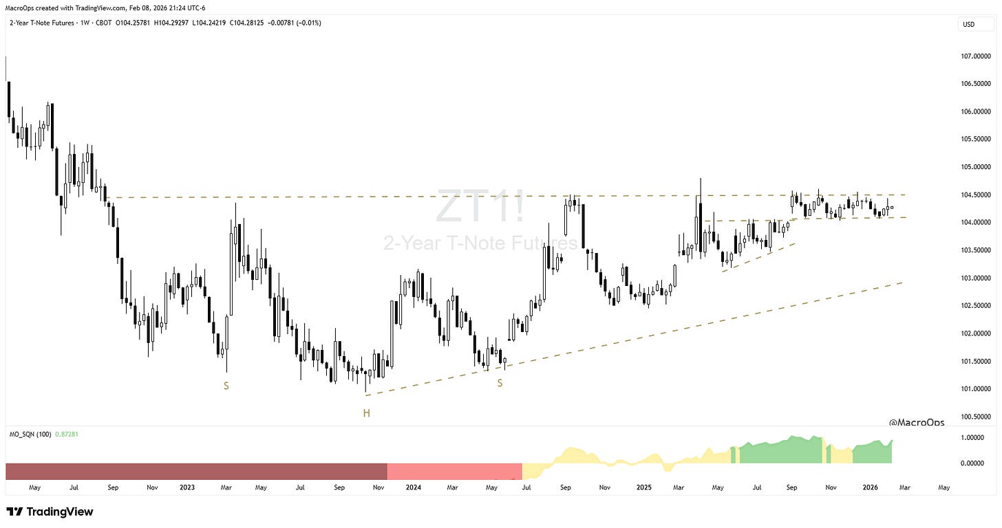 8. 2-year UST Notes continue to be one of the more interesting long-term setups I’m tracking. They’re in a major compression regime. Have put in a multi-year inverted H&S bottom. And are now consolidating right below the neckline in another compression regime. A big move is coming... My bias is up. We are long and will add aggressively on a breakout.