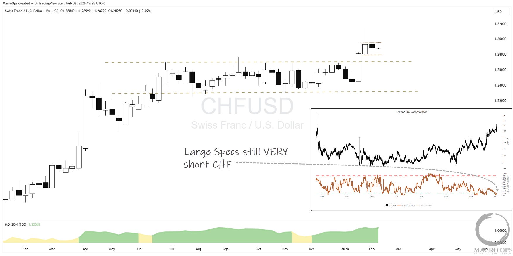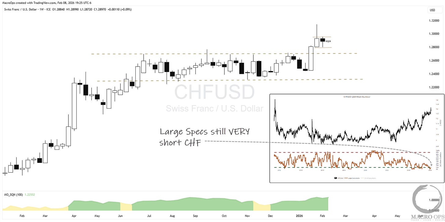 9. The Swissie is wedging after a breakout from a large 9-month rectangle / compression regime. We bought on the breakout, took partial profit on the quick move, and are looking to add on a move above last week’s high. Also, Large Specs remain very short.