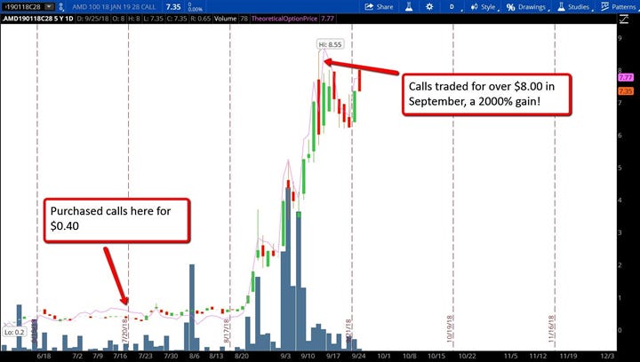 This question often circulates in the Macro Ops Collective chat room. Back a few summers ago, we bought call options on AMD struck at $28 for $0.40. Those calls traded as high as $8.50 in the month of September — a 2000% gain: