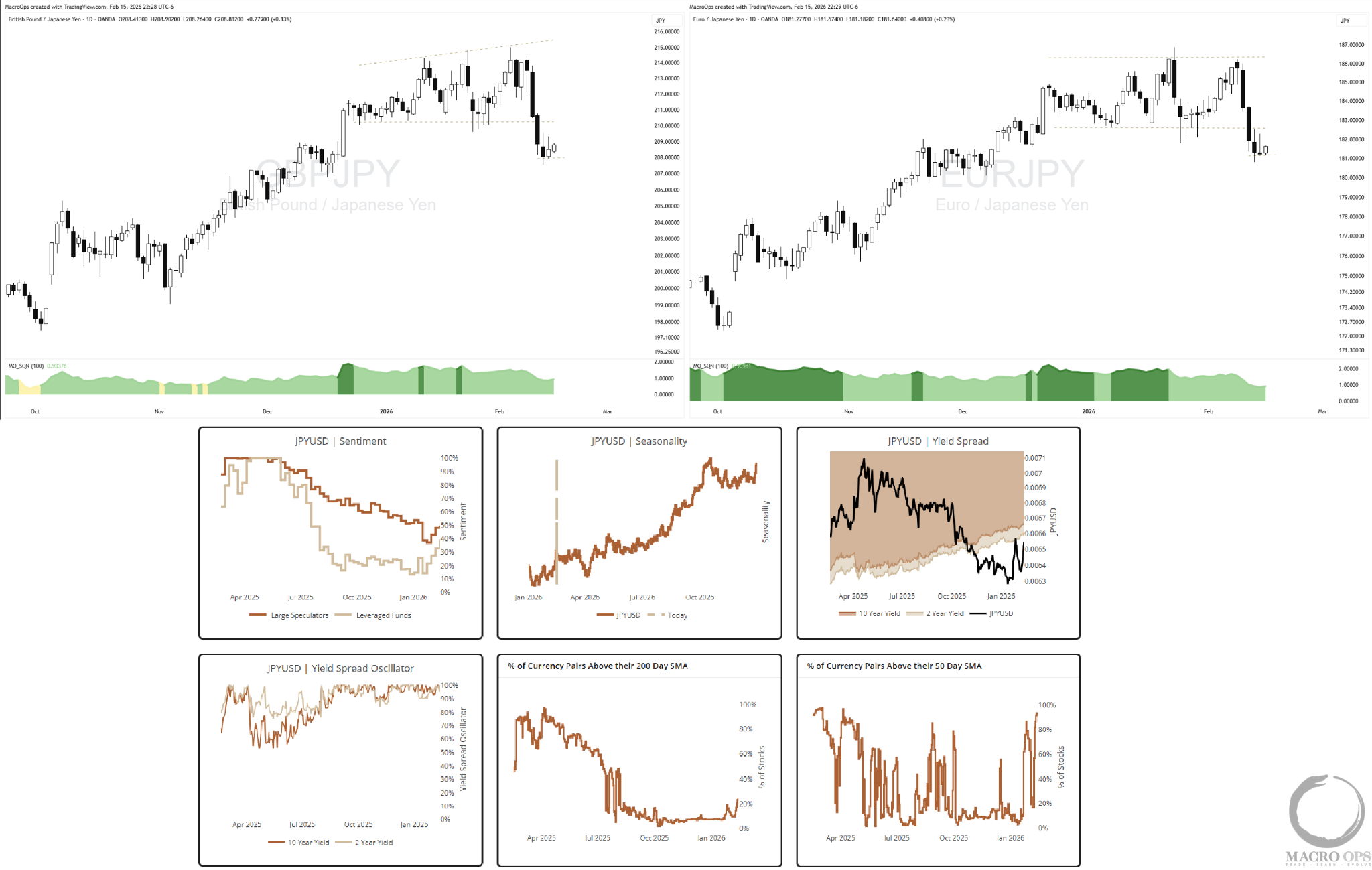 Additionally, yield spread momentum is in the 90th percentile, and both the FRBNY and Japan’s Ministry of Finance are signaling an increased readiness to intervene. We are looking to short GBPJPY or EURJPY (effectively going long JPY), as both pairs have broken down from significant topping patterns.