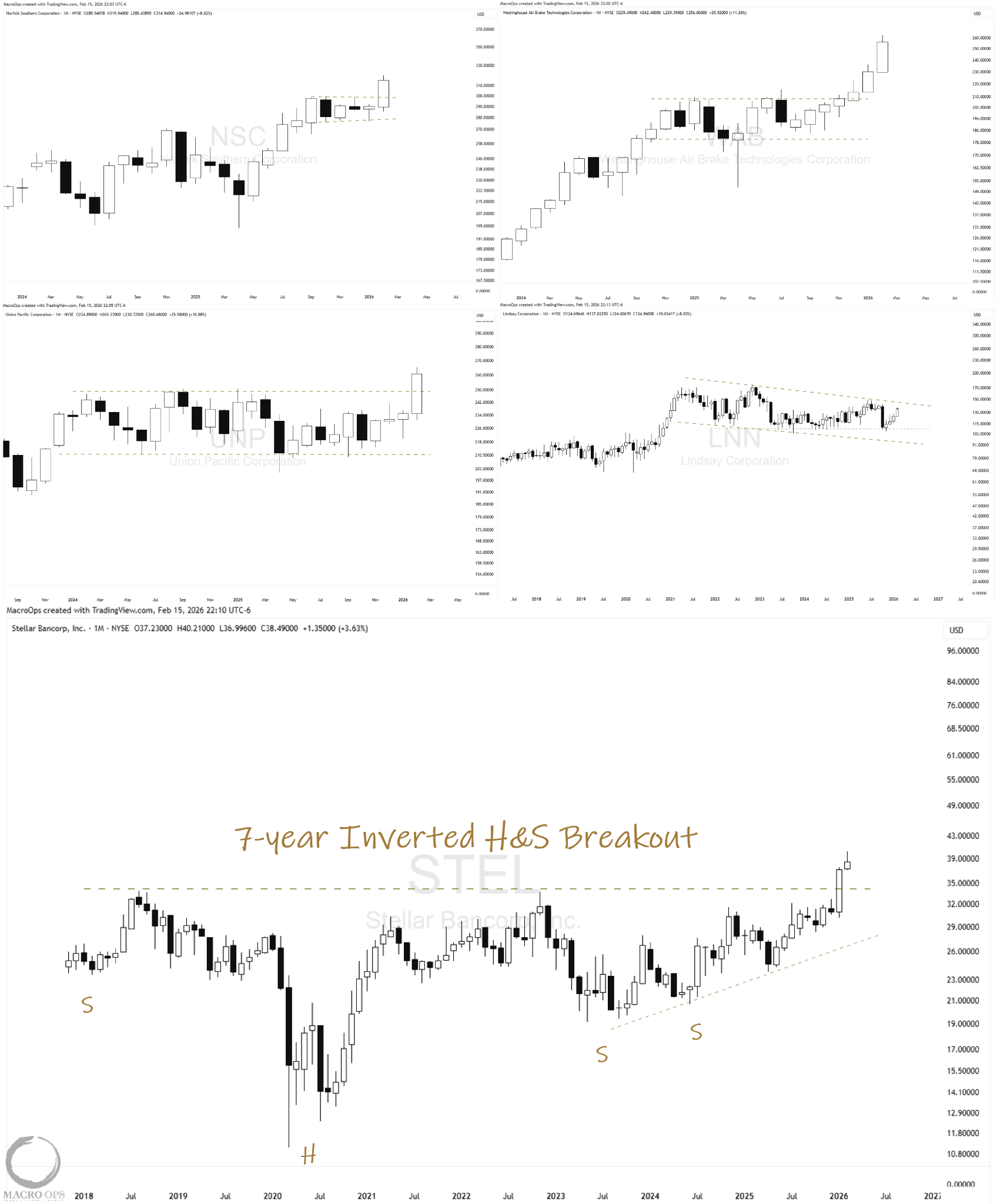 11. I pulled up a list of rail and rail-adjacent stocks and spent some time going through the charts. Below are my five favorites—NSC, UNP, LNN, WAB, and STEL—shown on monthly timeframes. There are some great-looking setups in this space.