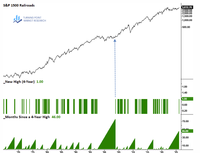 10. This is an interesting — and bullish — signal for the broader growth backdrop from Dean Christian, who notes that “a long-term chart (monthly data) shows the railroad sub-industry is currently experiencing the second-longest consolidation on record. Notably, its prior breakout from an extended base in 2003 marked the start of a value-led equity cycle.” You can read his full piece here.