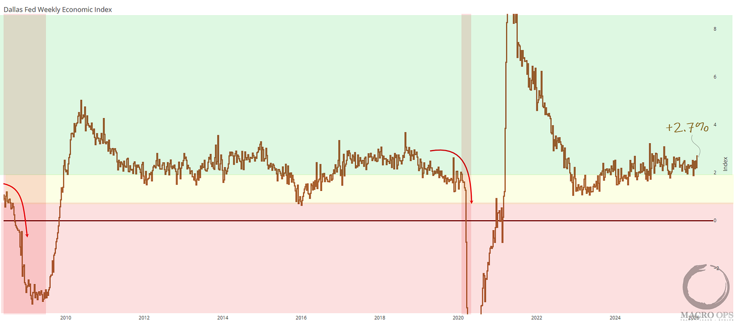 9. If Stagflation is in the cards for ’26, it likely won’t show up until the back half of the year, as many of our growth leads remain strong. Below is the Dallas Fed Weekly Economic Index, which printed at +2.7% last week.