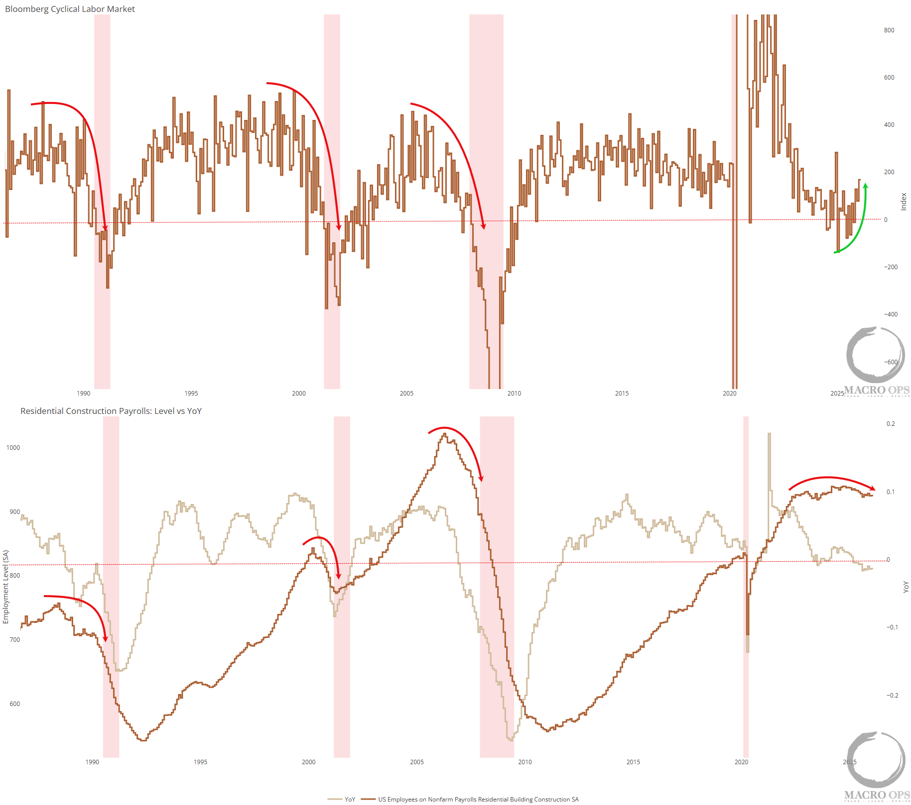 8. Recent labor data showed an upside surprise, though revisions to last year’s figures were weaker than expected. We view the labor market as neutral—neither exceptionally strong nor weak—a stance supported by our Cyclical Jobs Index and Residential Construction Payrolls. While year-over-year construction payrolls have turned negative following revisions, the nominal data is merely moving sideways.