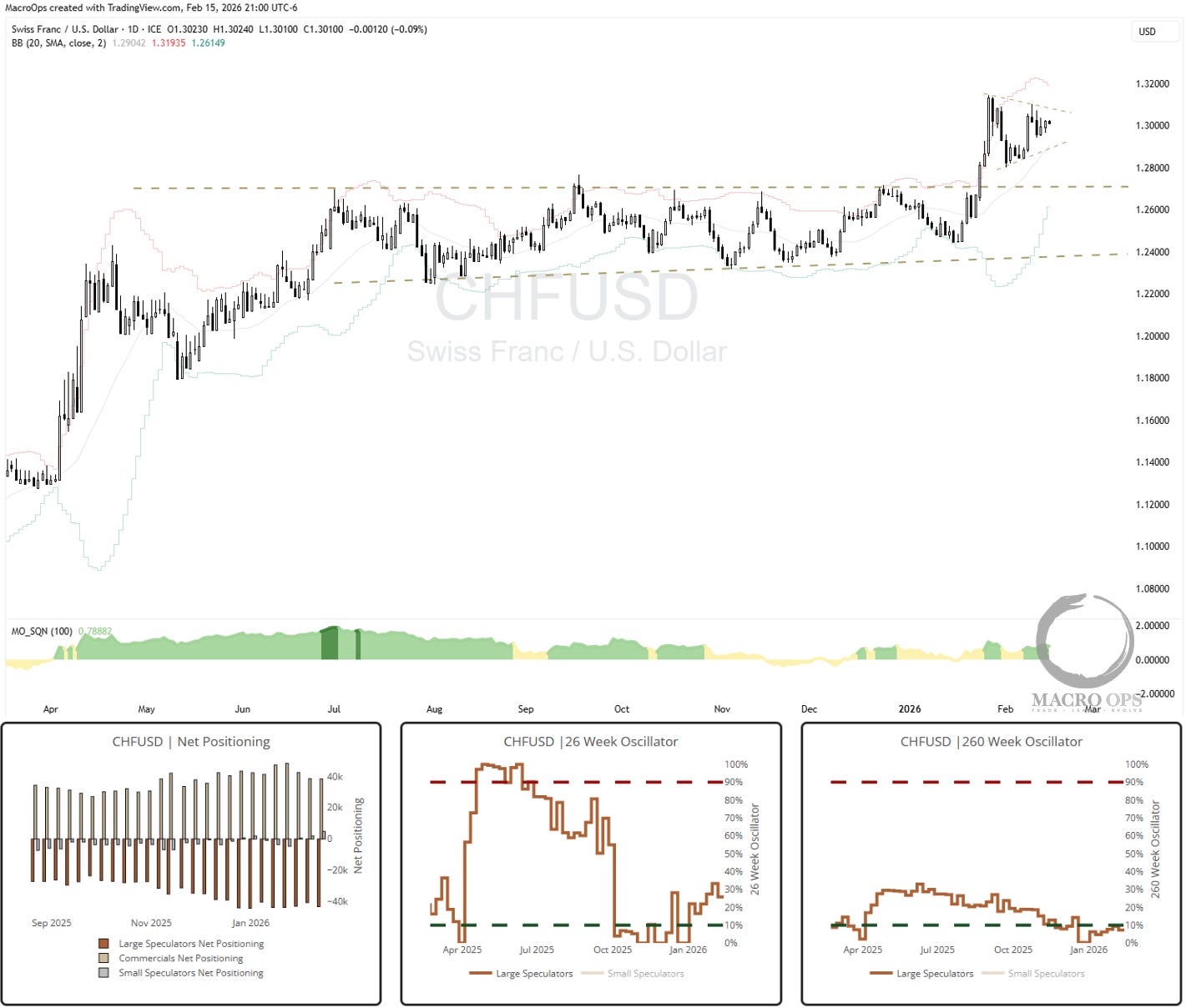 2. Our two most compelling positions are currently long Swiss Franc (CHF) and long 2-year US Treasuries. The Swissie is coiling above a seven-month rectangular base while large speculators remain heavily short; we intend to increase our position once it breaks out from this wedge.