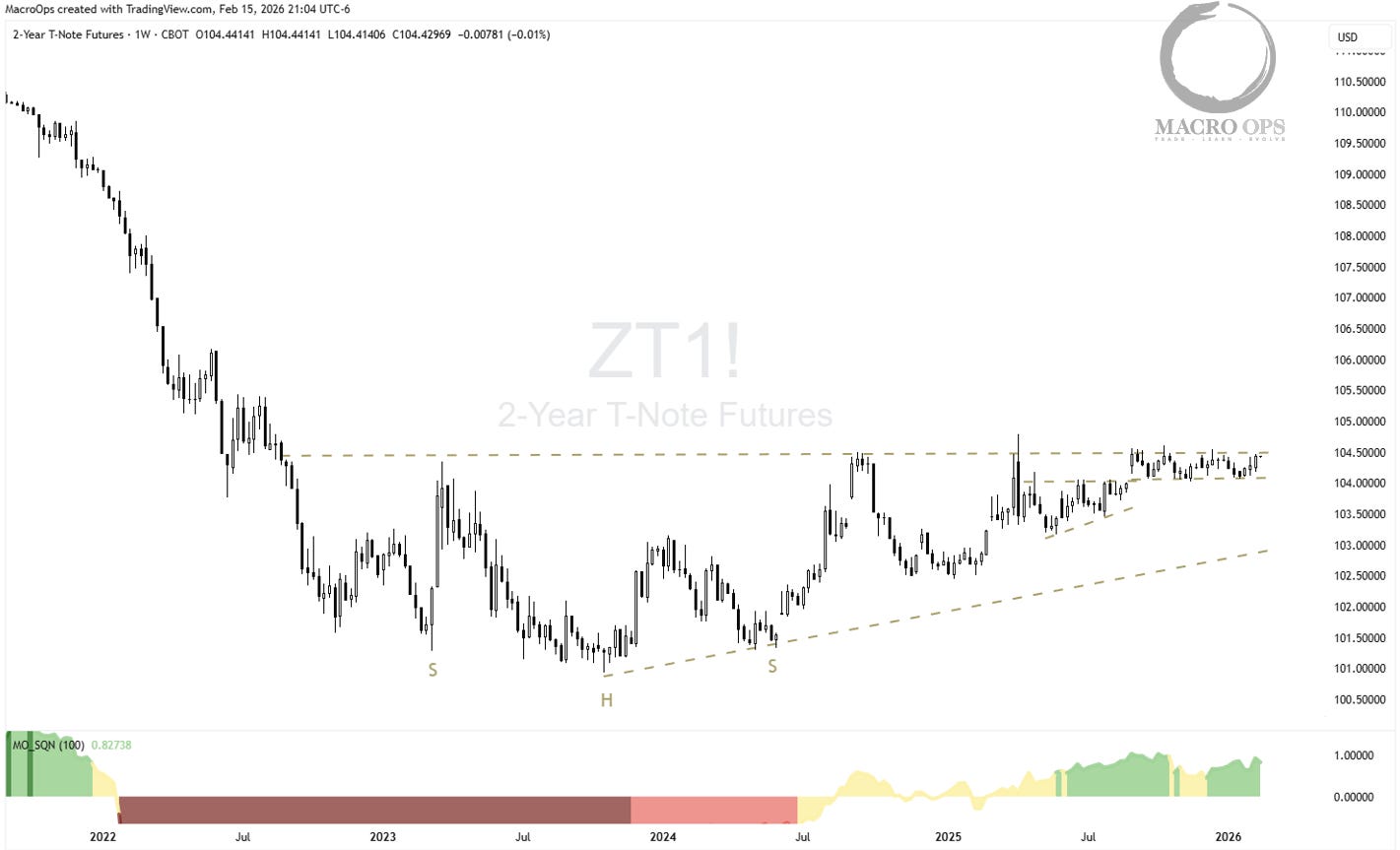 3. We’ve been writing about this setup for nearly a year now. The chart has nested compression regimes. This means a BIG move is coming. Our bias is long (perhaps on the narrative of an AI productivity boom = low inflation), and we hold a small starter long position. But we’re willing to play this in either direction. Pay close attention, a breakout is coming soon…
