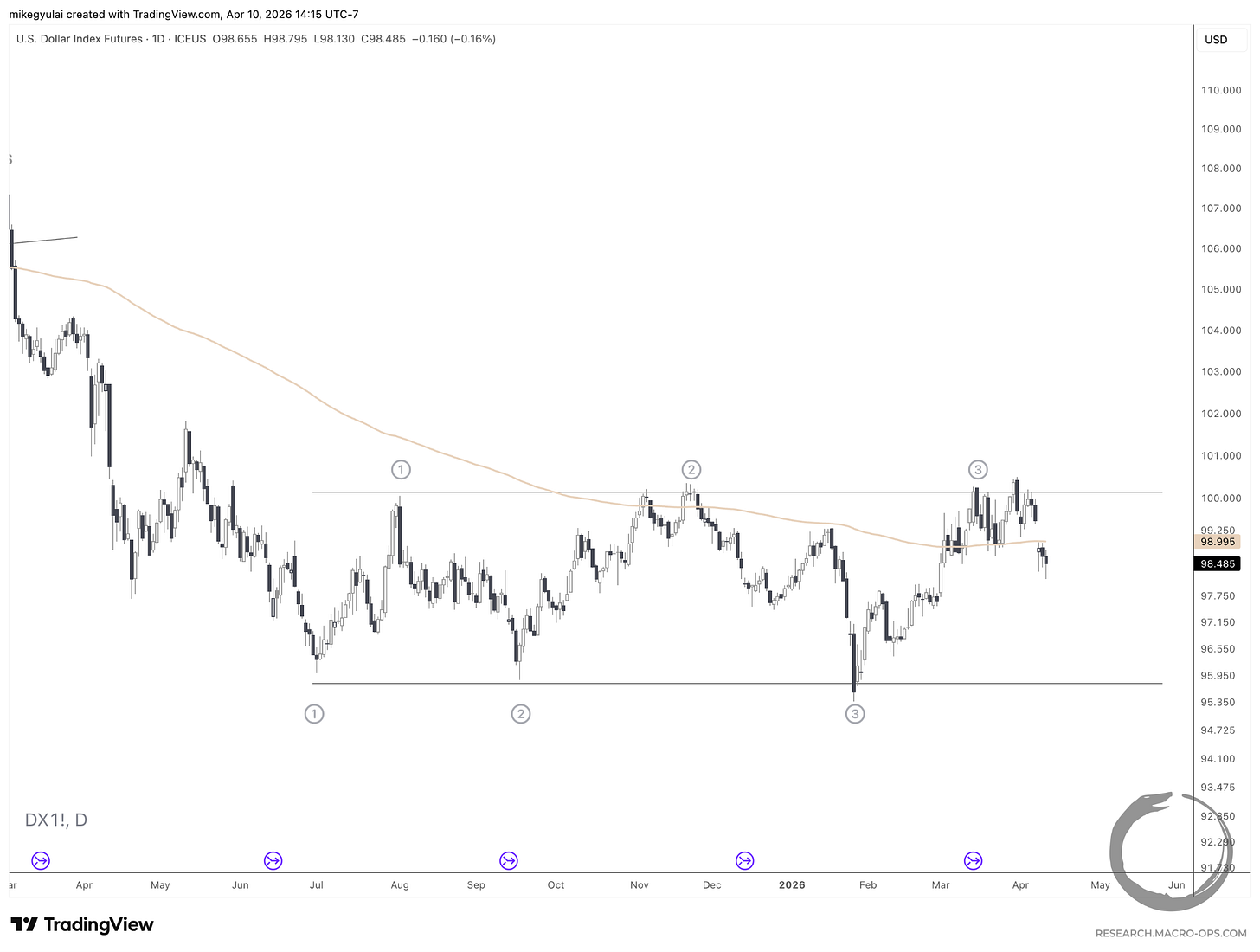 The Dollar continues its rangebound action between ~96 and ~100. Both boundaries have been tested multiple times. I’d love to see price tighten up against one of the two levels in anticipation of a breakout.
