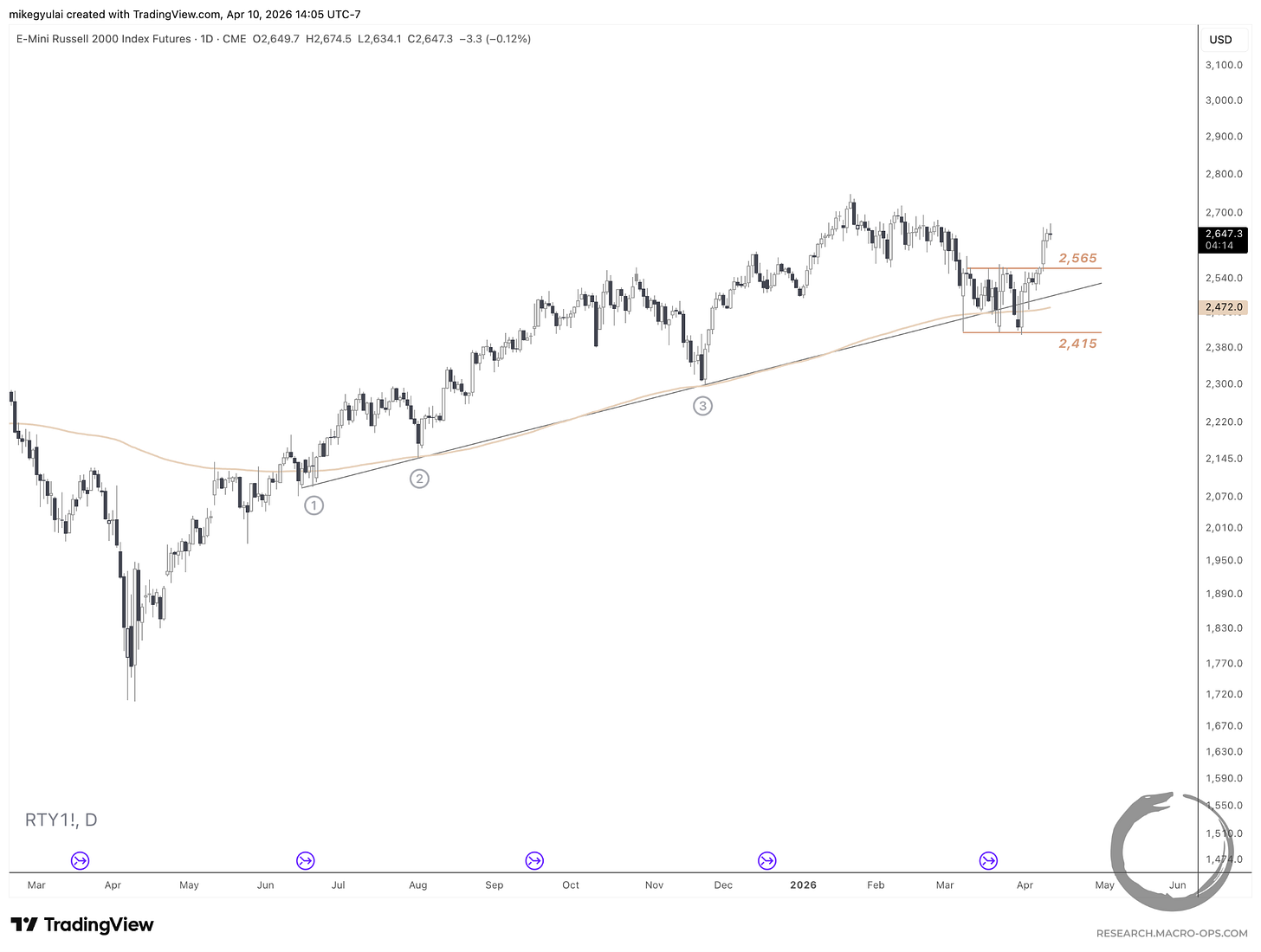 And, of course, there’s the Russell, whose tight price compression along the convergence of the 200EMA and multi-point trendline I featured last week.