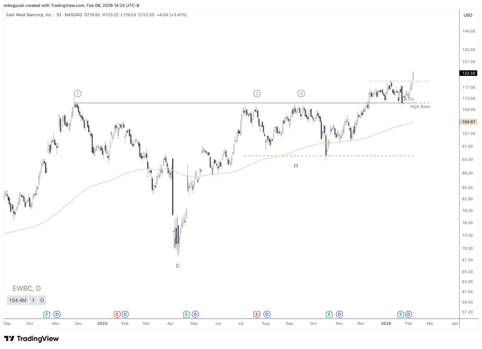 And second, East West Bancorp (EWBC) completed a High Base on Friday after consolidating above the breakout boundary for nearly two months.