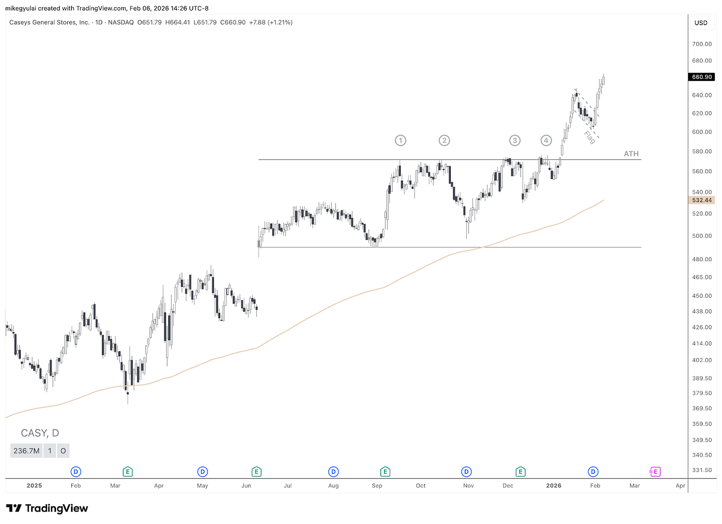 First, Macro Ops portfolio position Caseys General Stores (CASY) completed a small Flag on Monday and rallied the remainder of the week.