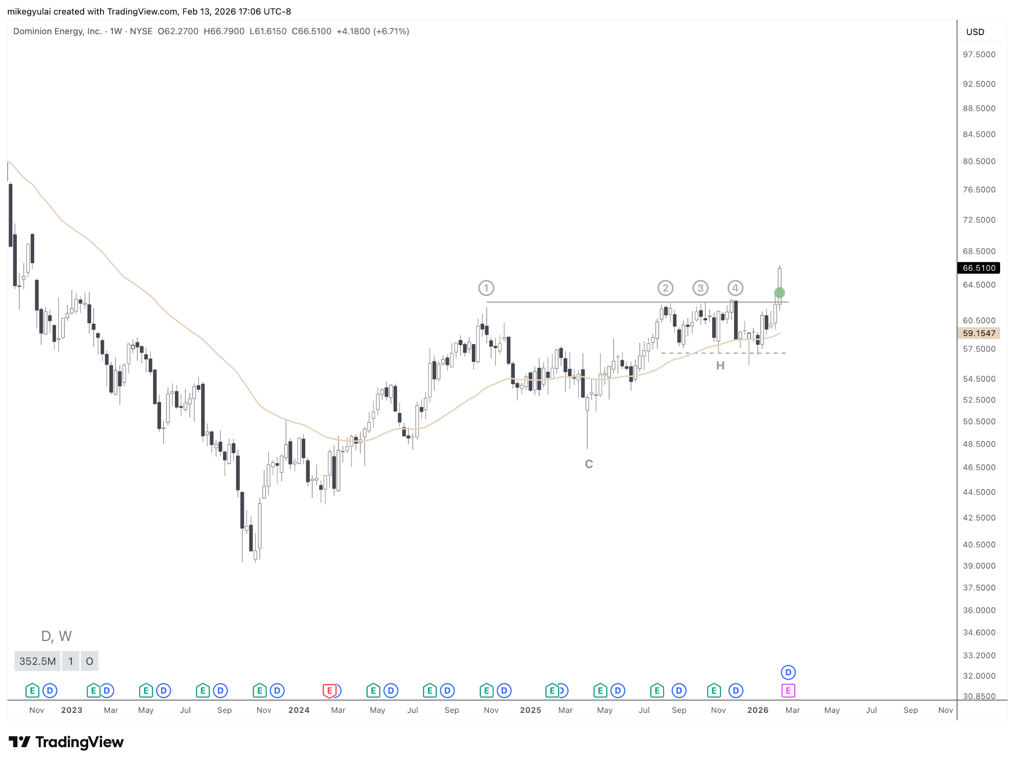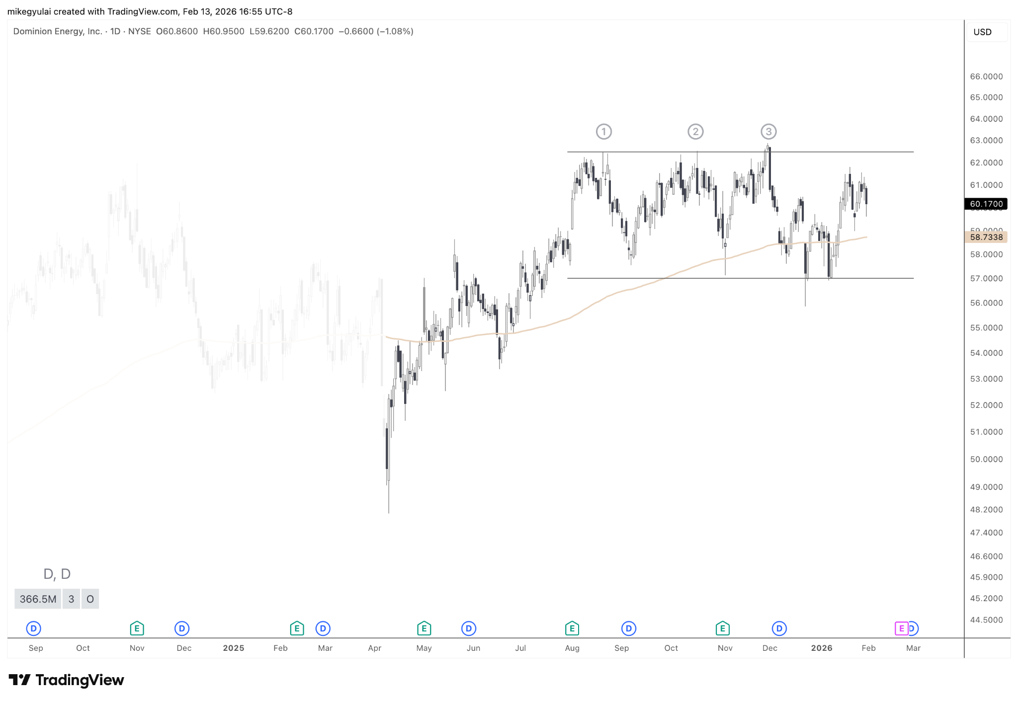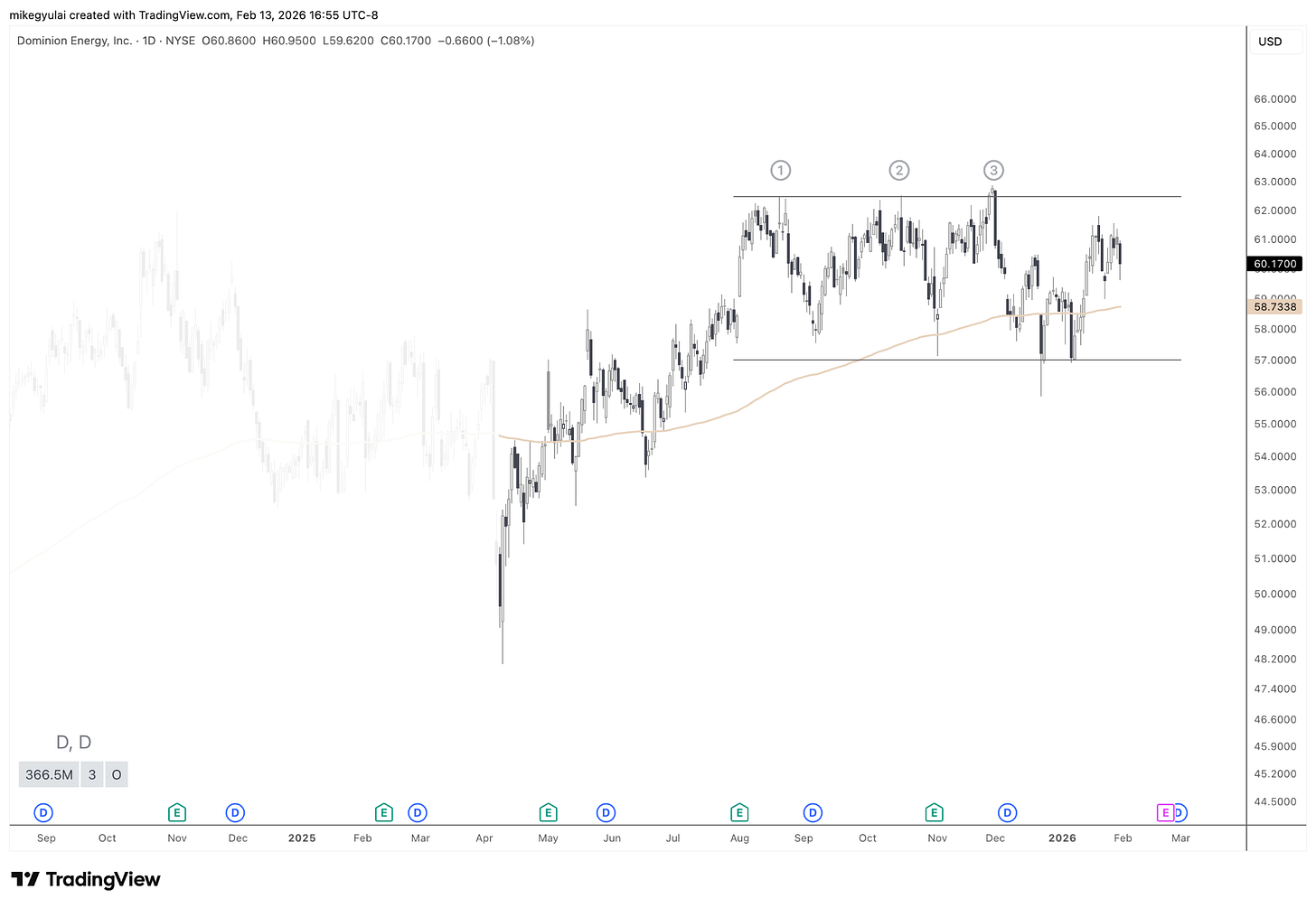 Dominion Energy has been on my watchlist since late last year. It fit every criteria I look for in my breakout setups: 1) a continuation pattern, 2) multiple months in duration, 3) directionally supported by a long-term trend filter, 4) with three or more reactions to a clearly defined price level.